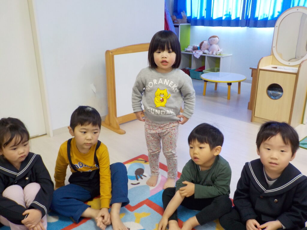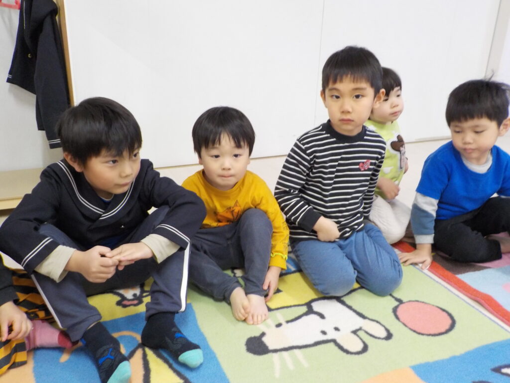帰りの会が始まると、ぱんだ組のペアの友だちがうさぎ組の子と手を繋いでマットまで連れて行ってくれます。座り方や話の聞き方などはペアの友だちの手本を見ながら、真似して挑戦しています。