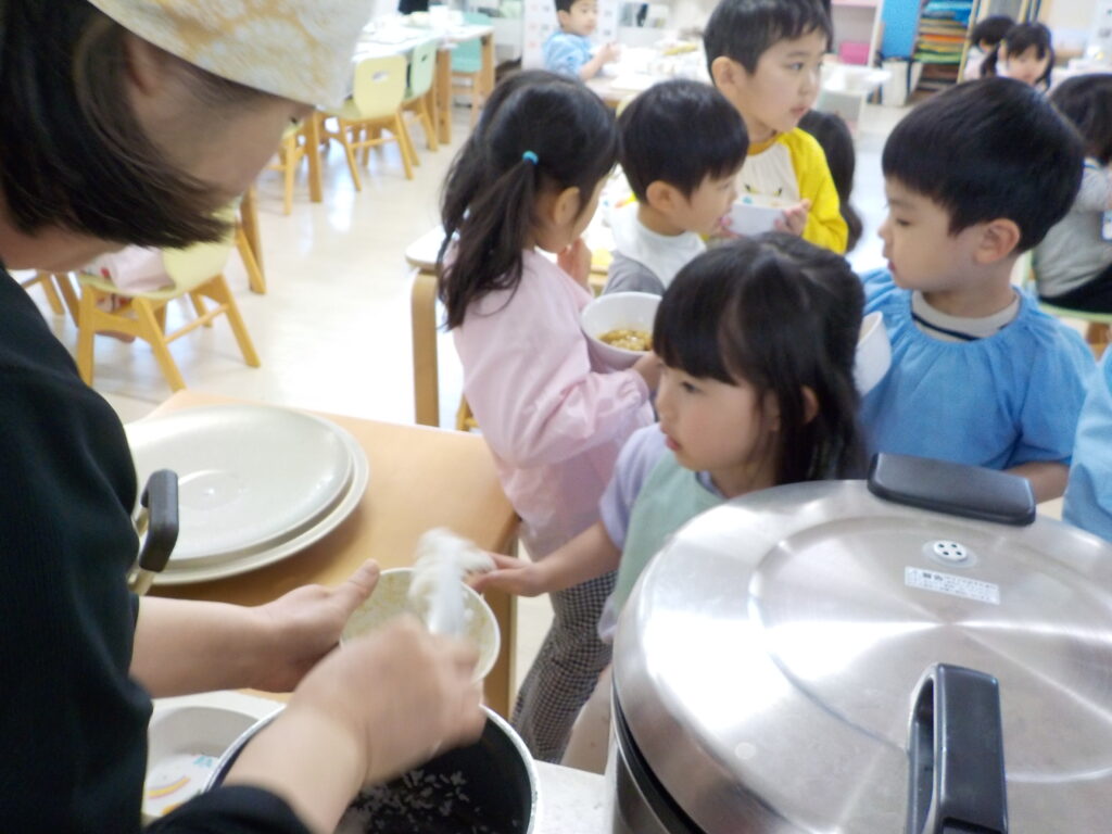 完食してからおかわりにくることが出来るようになりました。献立の名前を伝えておかわりをお願いすることが幼児組のルールですが、まだ献立の名前を覚えられないので、ペアの友だちが一緒に給食ボードを見に行き、おかずの名前を教えてくれます。