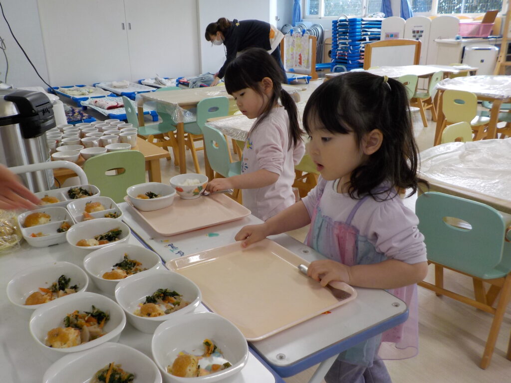 給食の時間は幼児組の友だちのようにトレーで配膳を頑張っています。先日からは幼児組の友だちに混ざってチームに入れてもらいました。お兄さんお姉さんに教えてもらいながら楽しく給食を食べています。