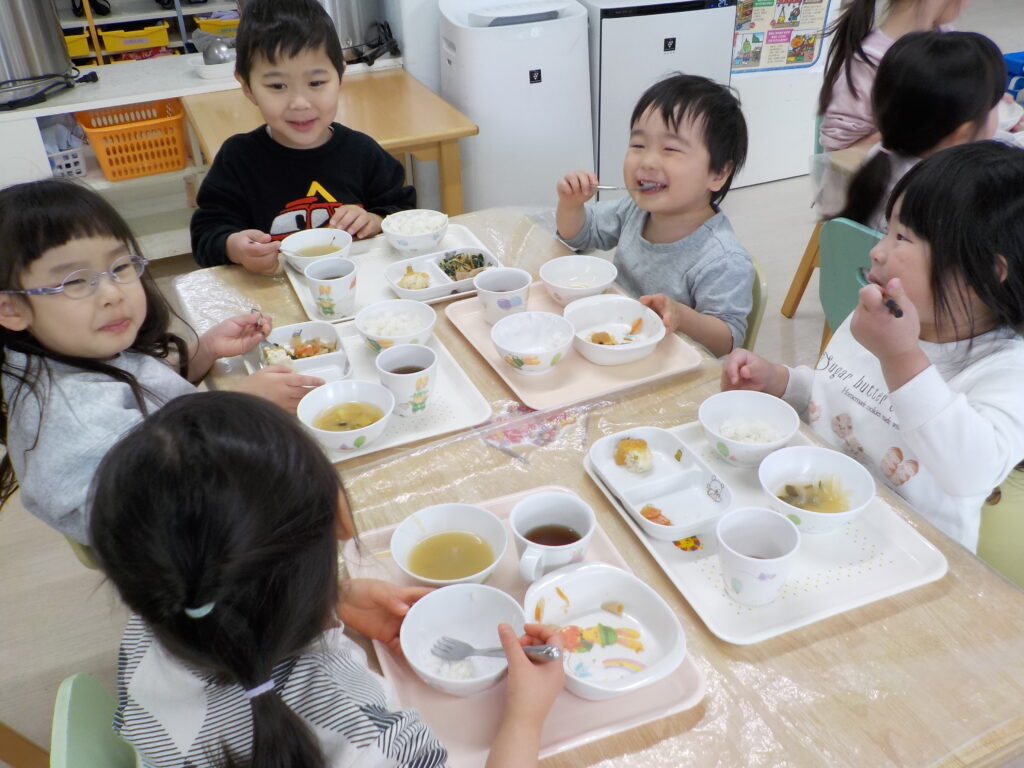 2月に入ってから移行に向けて幼児組で給食を食べている子ども達。最近では幼児組で過ごす時間も増えて、色々なことを覚えて頑張っていますよ。