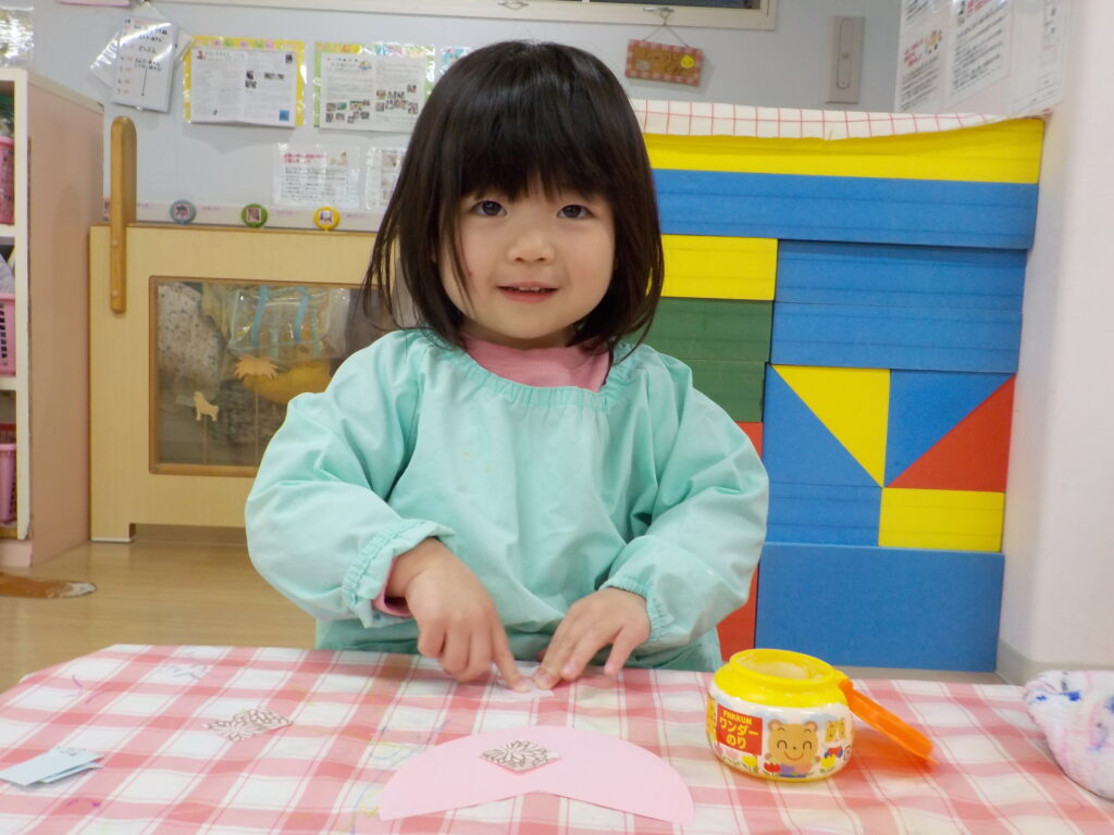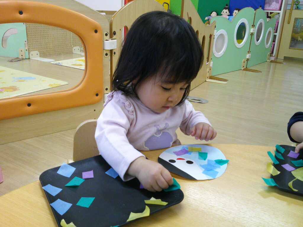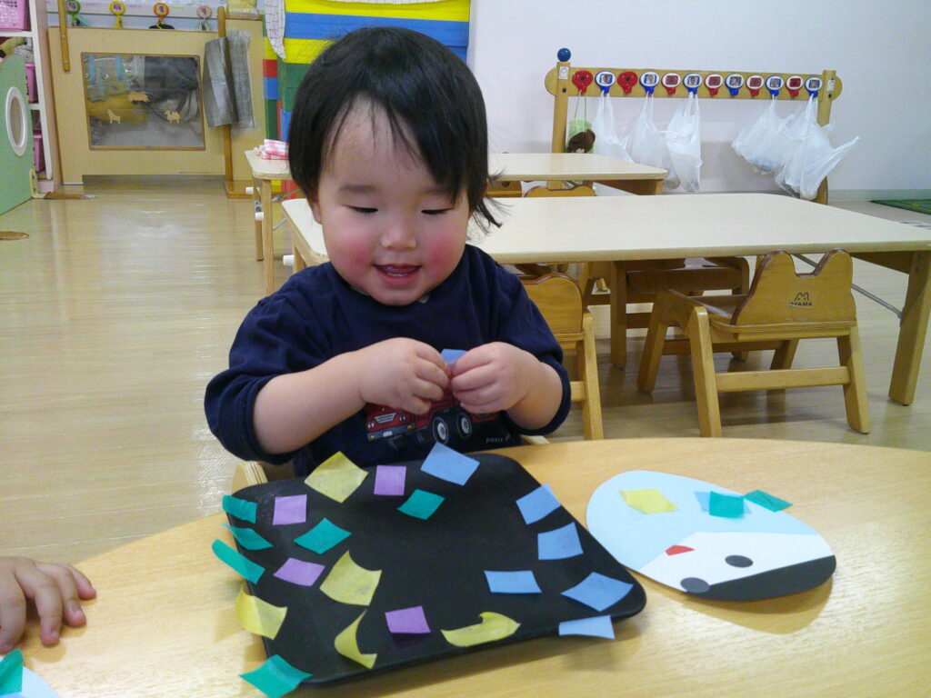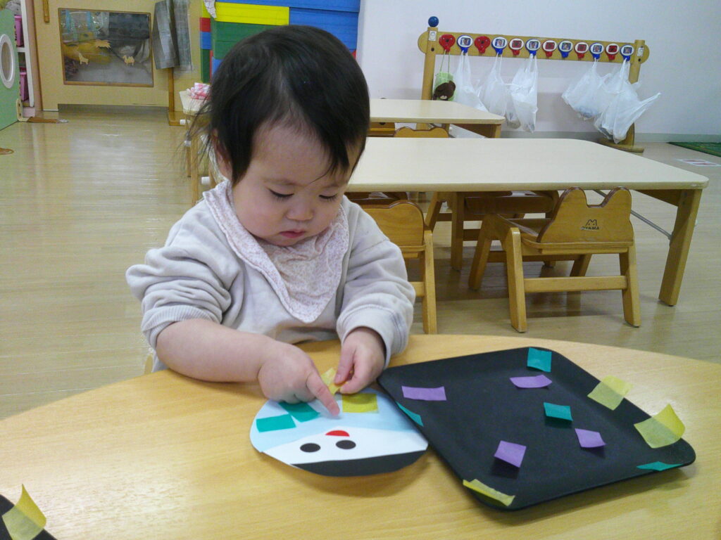 まずは、ひよこ組。指で摘まんだり、離したりすることが上手になりました。その姿から、製作でマスキングテープを剥がしたり、貼ったりすることを取り入れましたよ。