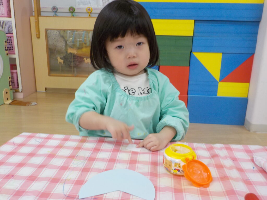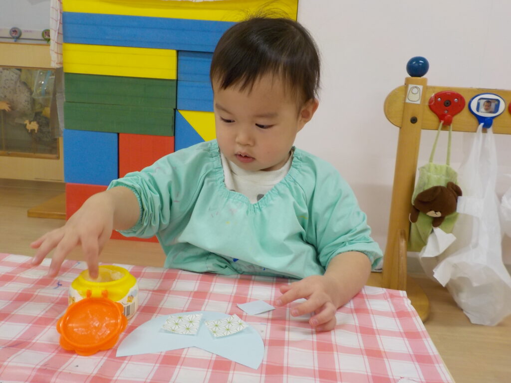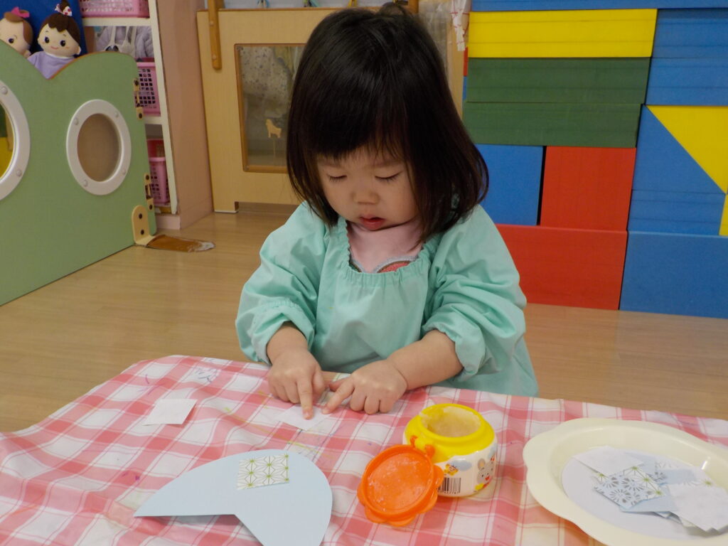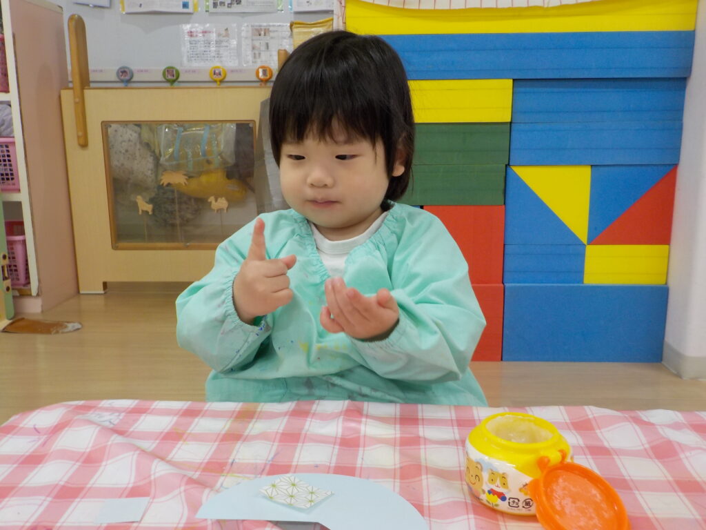 「1の指」と保育者の手本を見ながら、人差し指を立てて糊を付けたり、「ちょっと」と言いながら糊に指をそっと付けて糊の量を調整することができました✨