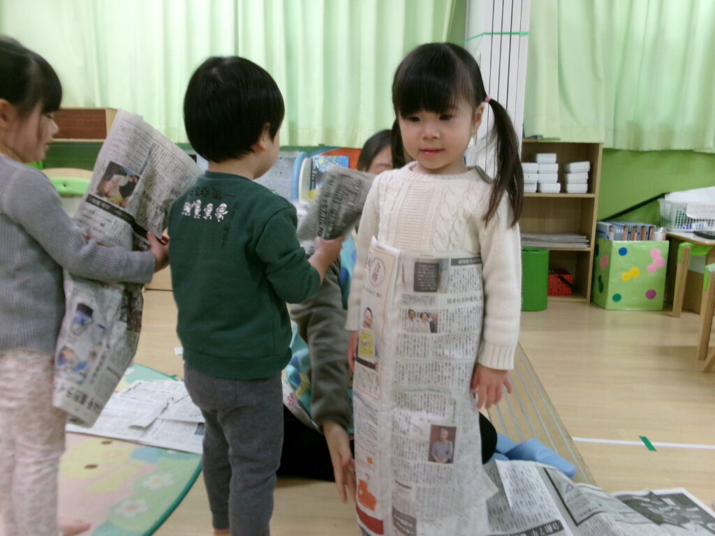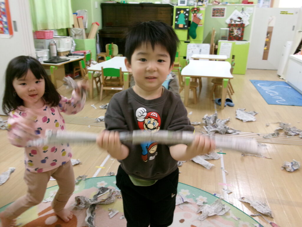想像を膨らませて思い思いにちぎったり…丸めたりして新聞紙を様々な形に作る事が出来ました!