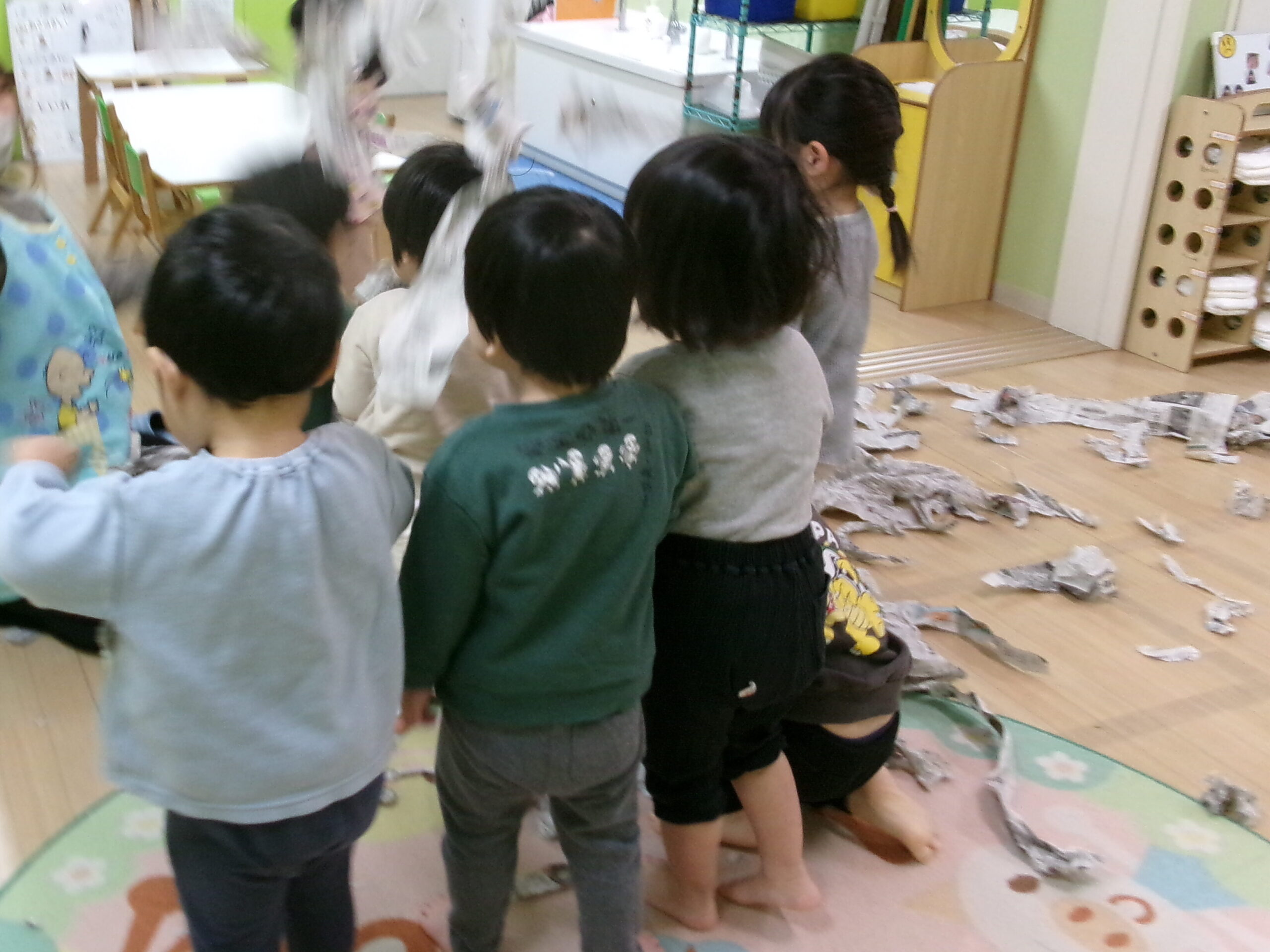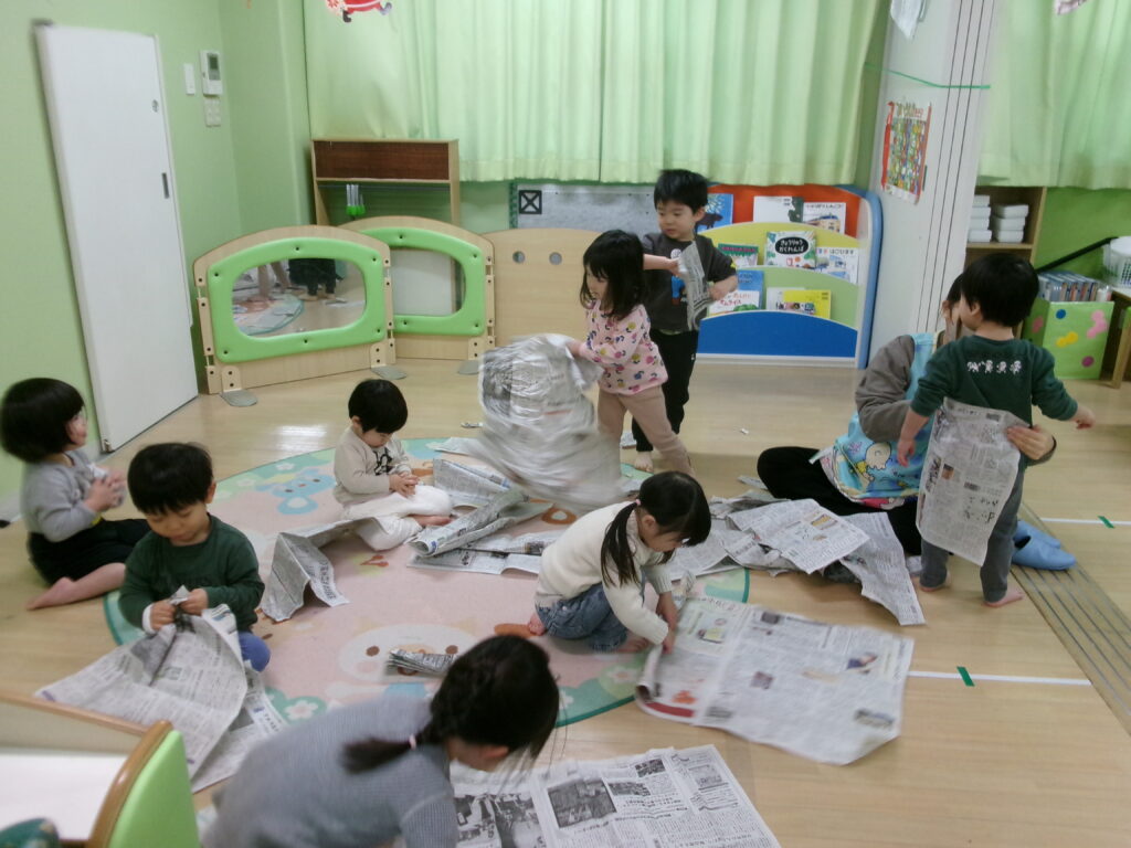 先日お部屋で新聞遊びをしました。