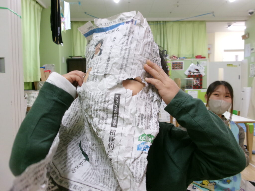 新聞紙に穴が開いている事に気付くと「おばけみたい」とおばけになり切って