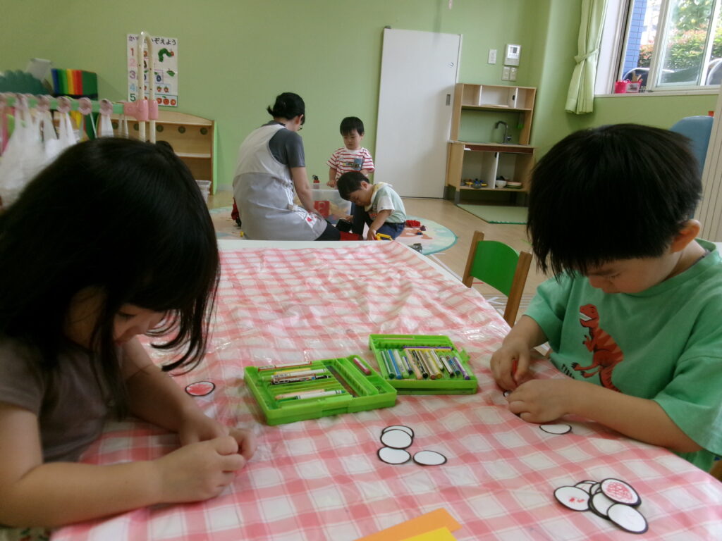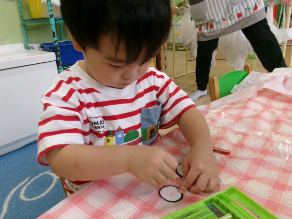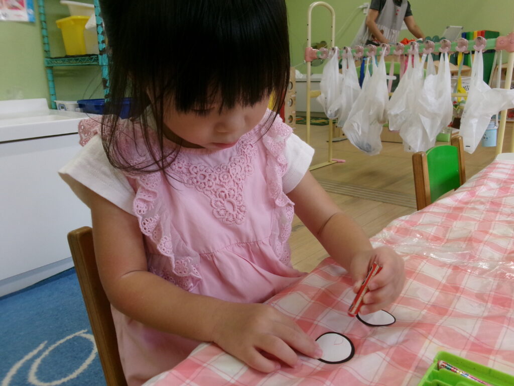 うさぎぐみでは、秋にちなんで赤とんぼの製作を行いました。