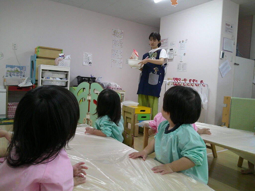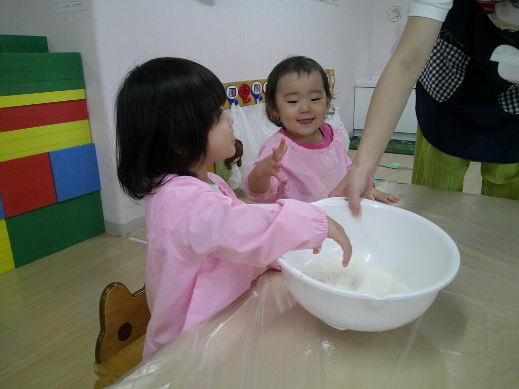 片栗粉と小麦粉を用意し、容器に入れていきます。りす組さんは椅子に座って興味津々で保育者の話に耳を傾けていました。