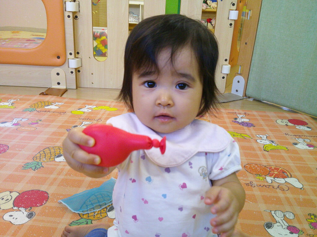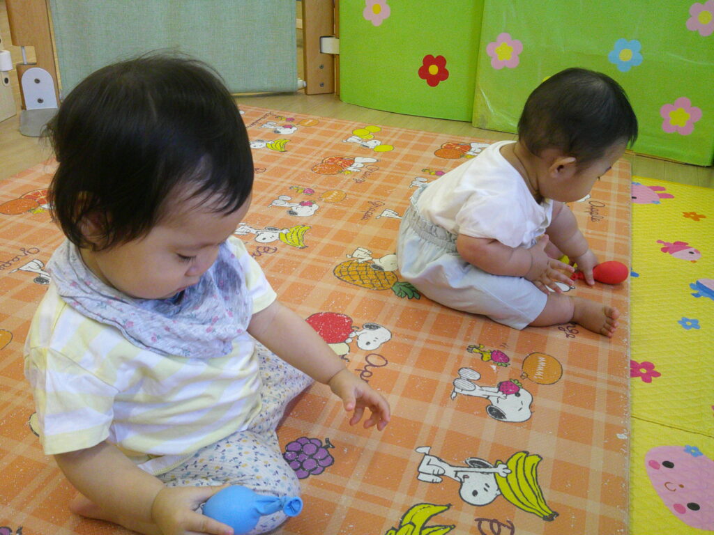 ひよこ組は小麦粉と片栗粉を風船の中に入れて感触を確かめました♪