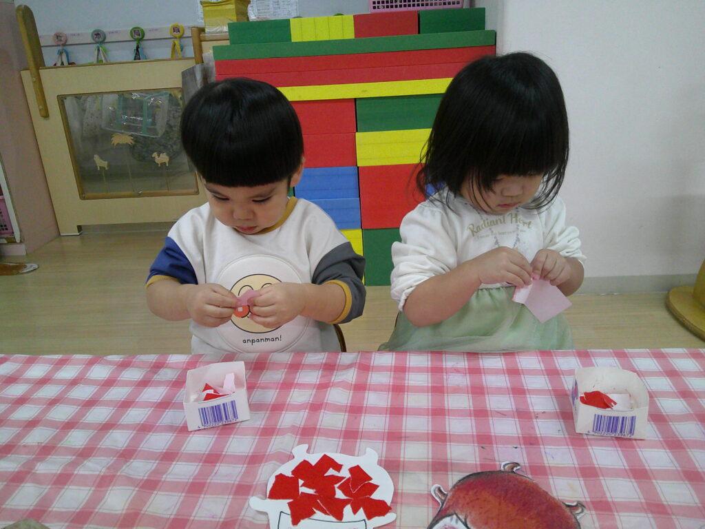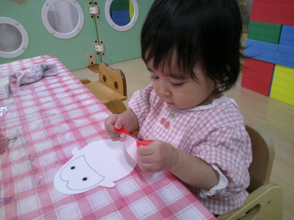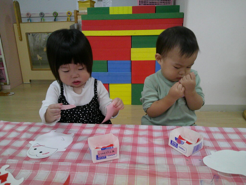 乳児組では千歳飴を入れる袋を、子ども達が大好きな「だるまさんがシリーズ」のだるまさんをメインに作りました。子どもが行ったのは、折り紙をちぎり貼り付ける、シールで目を付ける、クレヨンでほっぺを描くことです。
