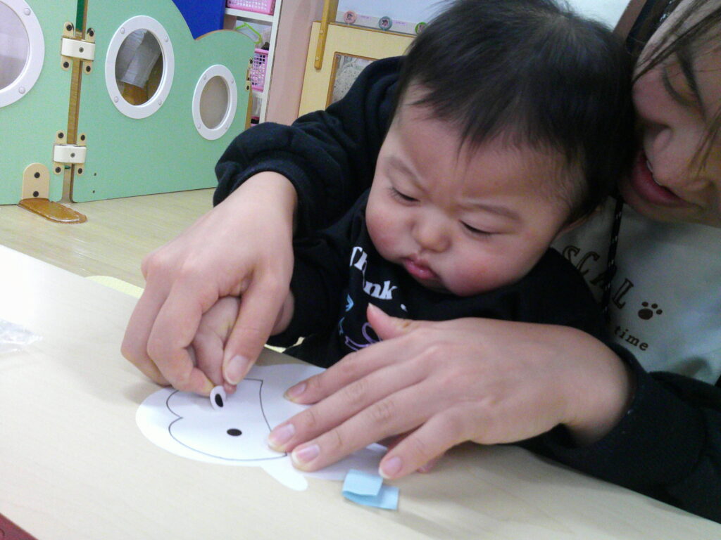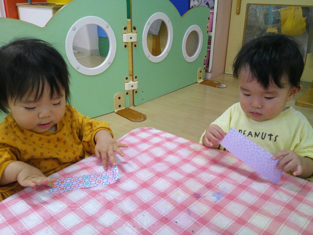 ひよこ組さんも折り紙に触れて、保育士と一緒に挑戦してみました。