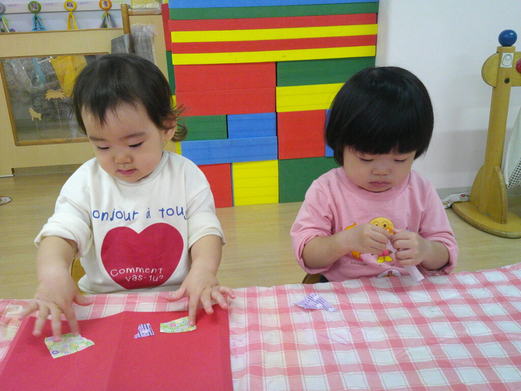 折り紙をちぎるのが難しいと「どうやるの?」「やって~」と保育者に援助を求めていました。少しだけ切り込みを入れてあげると次から次へと自分で破る姿がありました。