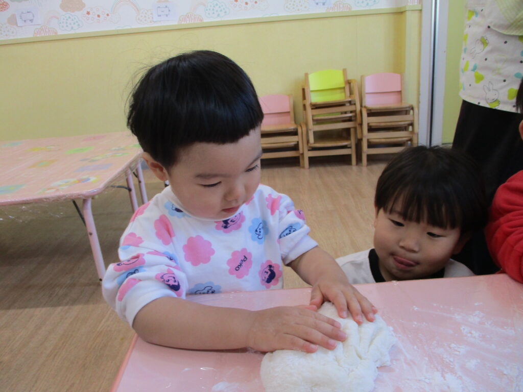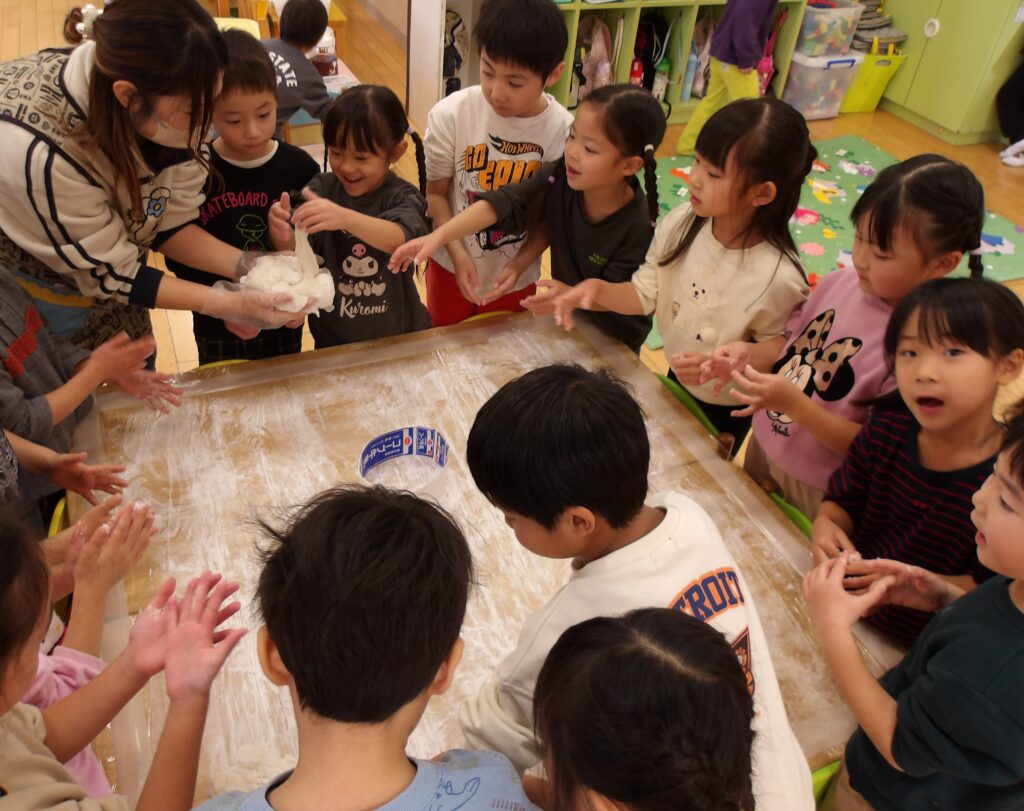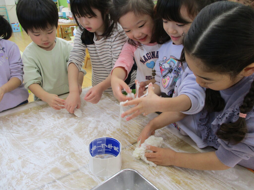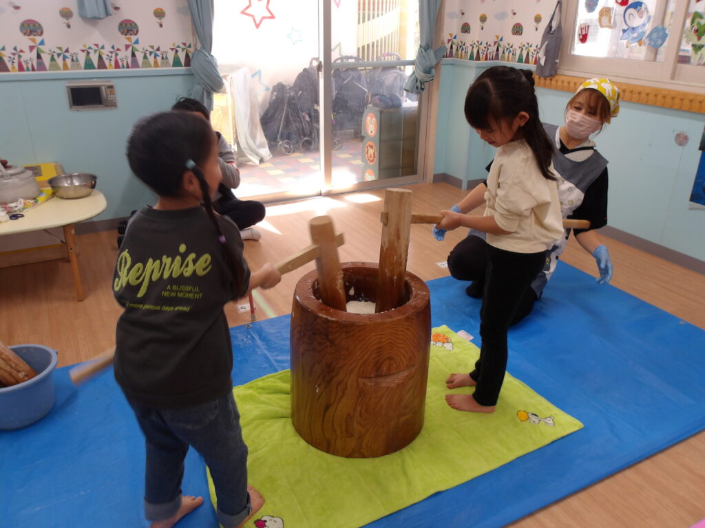 蒸したもち米を見ると「いつもたべているおこめみたい」「ごはんのにおいがする」と興味津々のみんな。先生が杵でついておもちに変化させると「のびてる!」「おもちになった」と大盛り上がりでした!子ども達も順番に杵を持っておもちつきを体験しました。