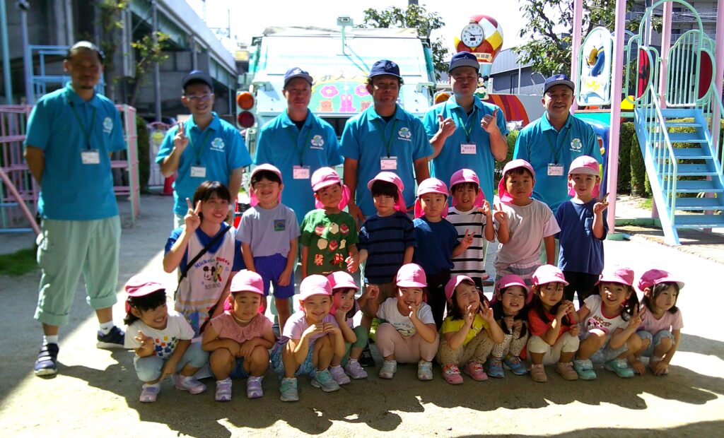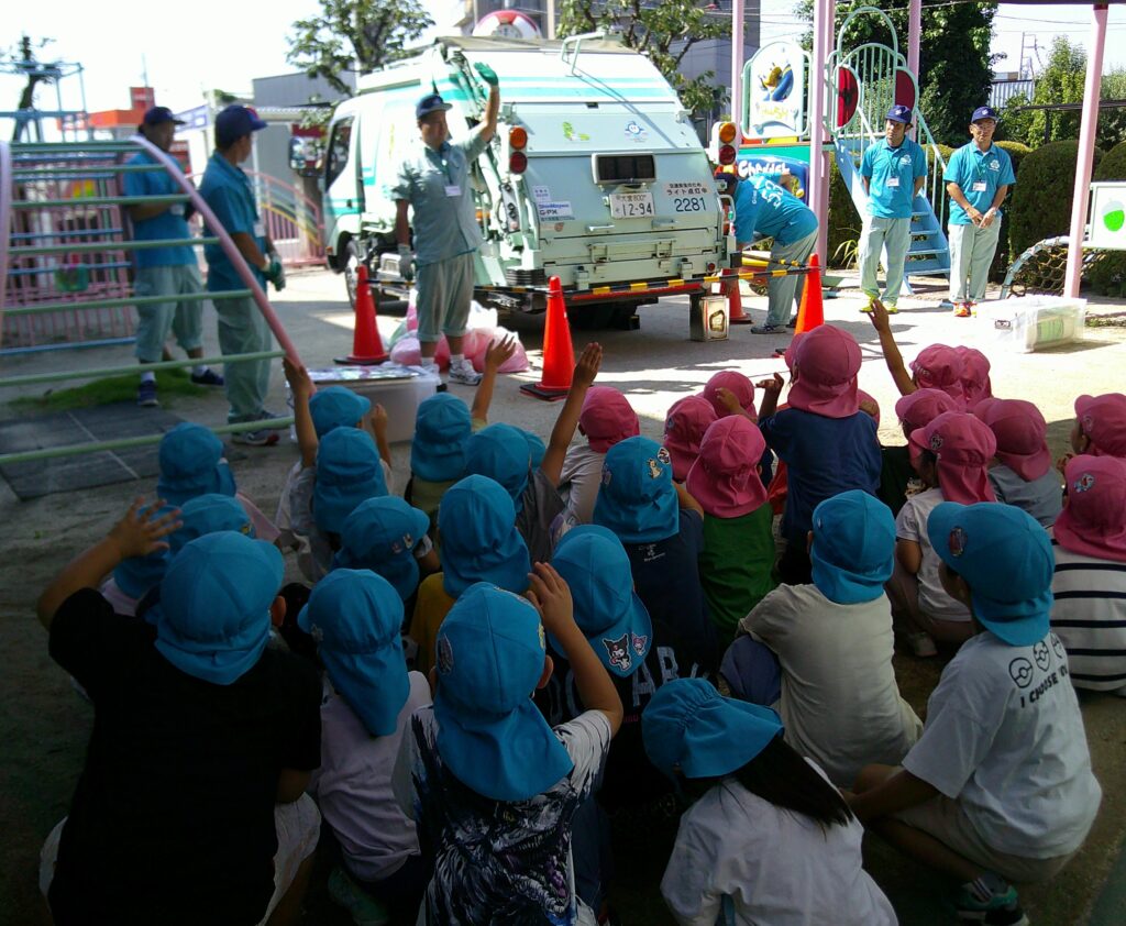 ゴミ収集車を間近に大興奮の子どもたち!実際に稼働する様子も見せて頂きました。