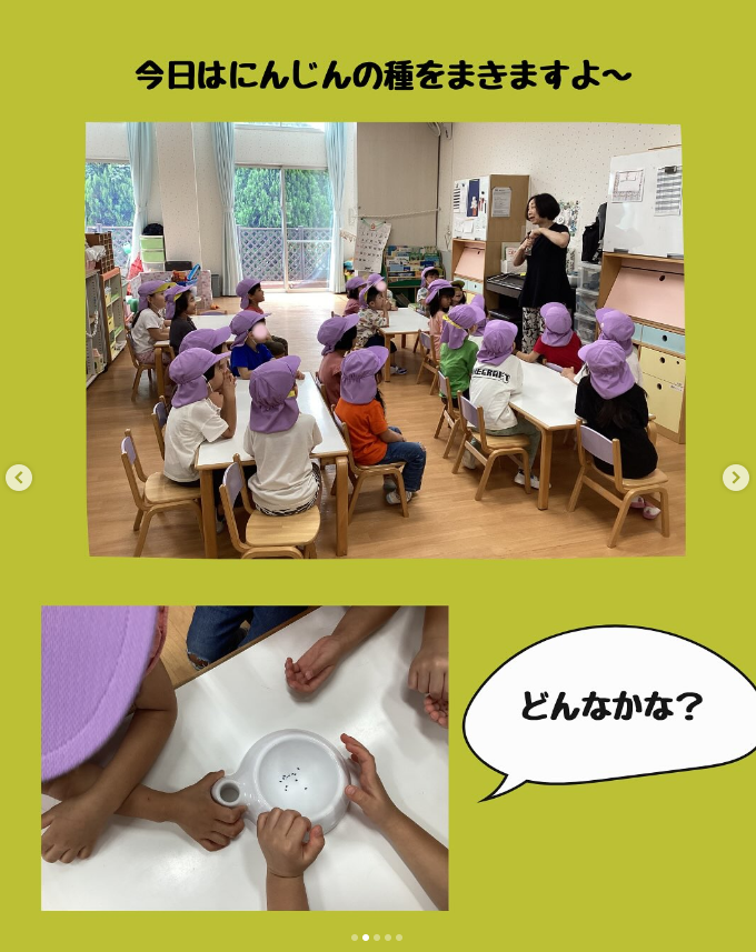 お皿に出したにんじんの種はとても小さく、子どもたちは「ちっちゃい!」と驚いたり、そっと触ったり、つぶそうとしたり…一人ひとりが自分なりの方法でじっくり観察していました。
