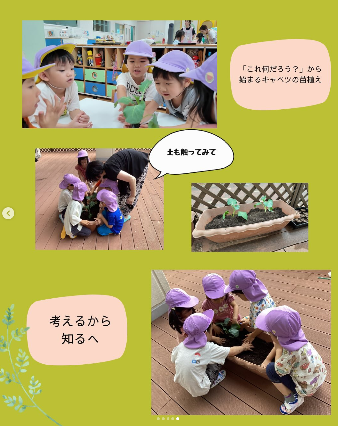 キャベツの苗を植えるときには、まずは「何の野菜だろう?」とみんなで考えてみました。子どもたちは葉の感触やにおいを感じ取ったりと、五感をフルに働かせて想像していました。