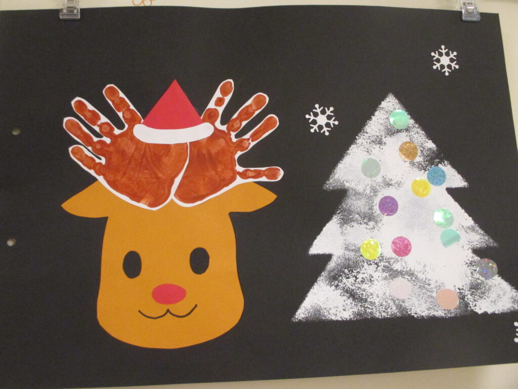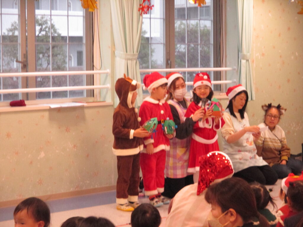 クリスマス会 2025 その1 2025-12-25 園内 クリスマスモード 月の制作だけでなく今月はお持ち帰りの制作もあり 事務所前も 世界で一つだけの作品 さあ クリスマス会が始まりました 先ずは持ち帰り制作の見せあいっこ 幼児クラスになると どんなところにこだわったのかまで自分でお話します「リボン結びを覚えてつけました」 らいおん組さんがお歌をみんなに聞かせてくれました お見せしたい写真がたくさんあるので第2弾で載せます!
