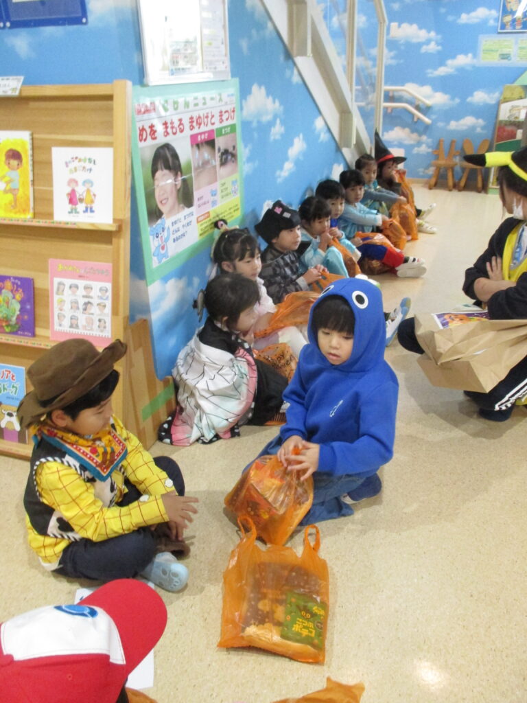年に一度 こんなお楽しみがあってもいいですね にじの樹保育園はにじの森保育園の子どもたちとの交流としてもお互いの園に行ってお菓子をもらっています にじの森保育園の子育てサロンのお友だちもきてくれます いい時間でした
