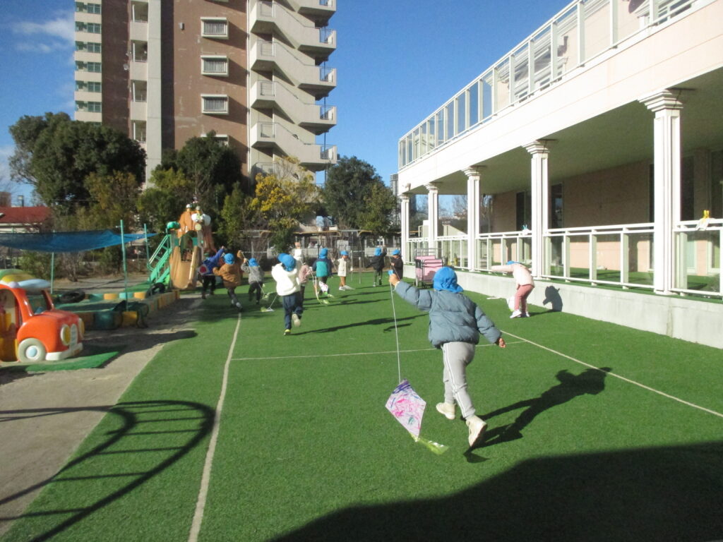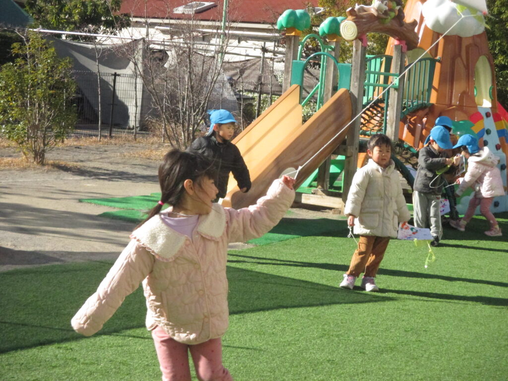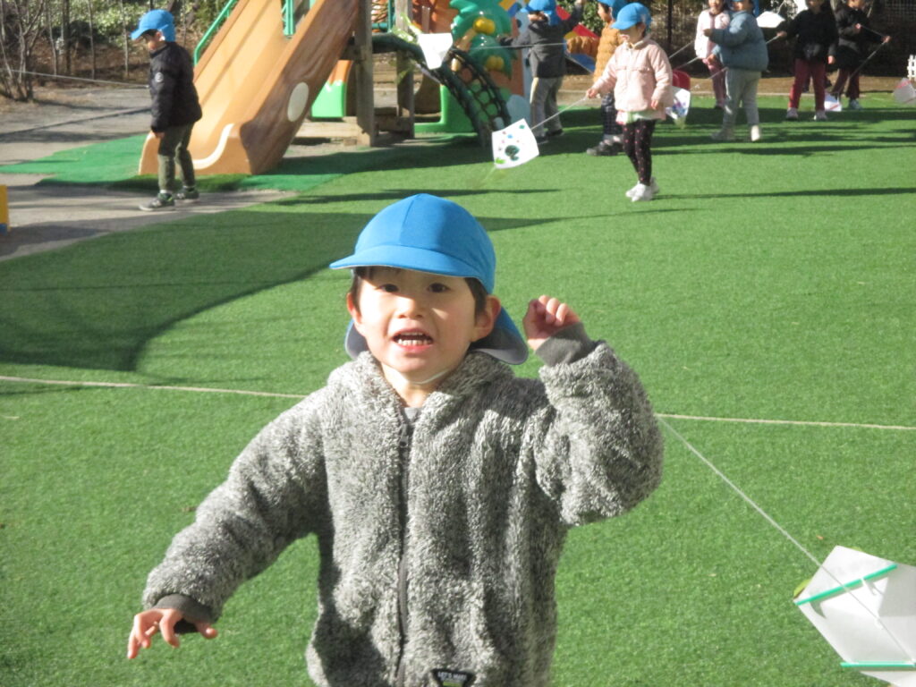 明けましておめでとうございます 2026-01-08 今年もよろしくお願いします 園内はお遊戯会前ということもあり お正月気分な様子はないように思います そんな中 凧あげをしていた様子もあったので少し載せてみます 自分たちで作った凧 どこまであがるかな? 紙が少し重たいのか あがらないかと思いきやこの日は風が強くて 反対に「故障したー!」と何度も持ってくる様子 でも楽しくてずっと走っていました お遊戯会練習の合間 いい時間だったようです