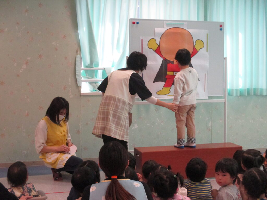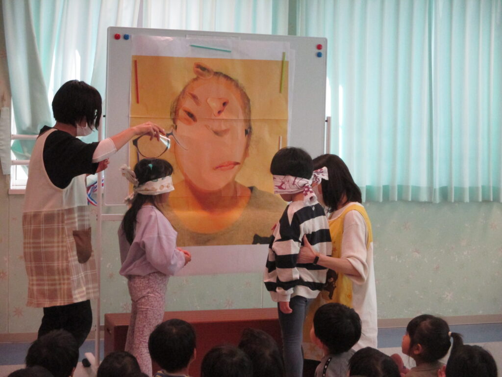 今回の出し物はお誕生児に福笑いをやってもらいました