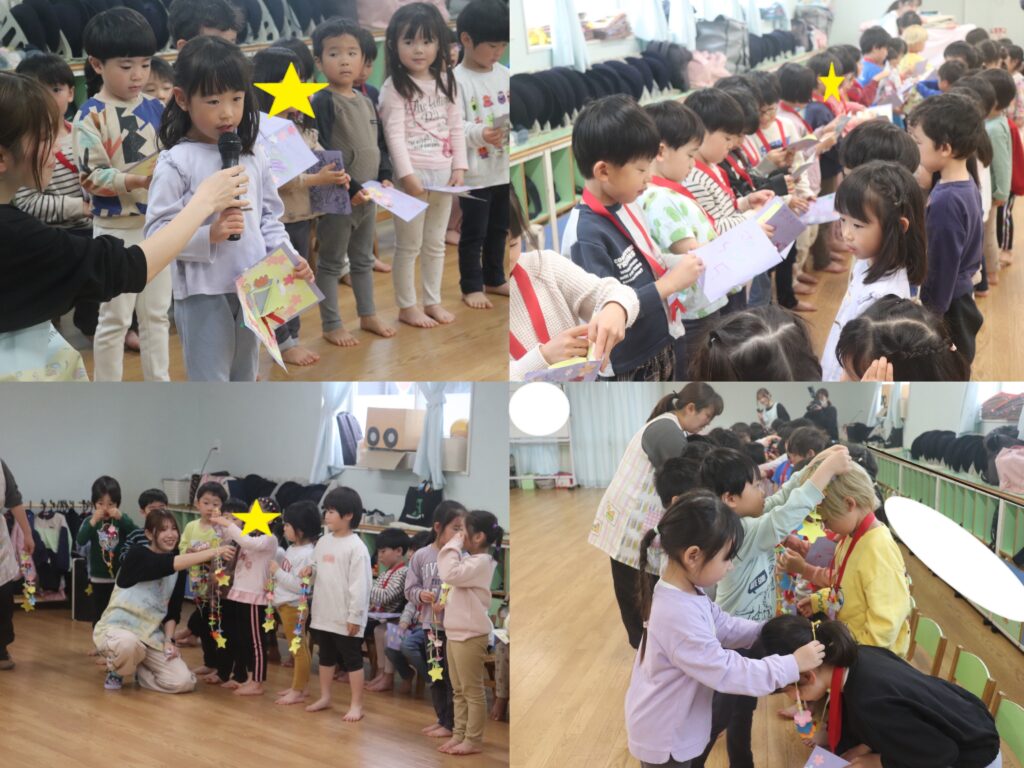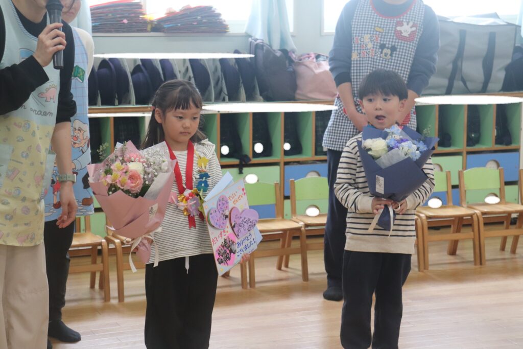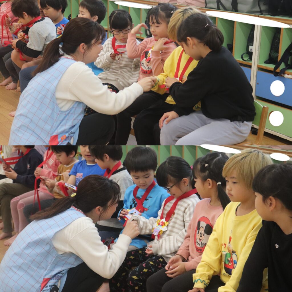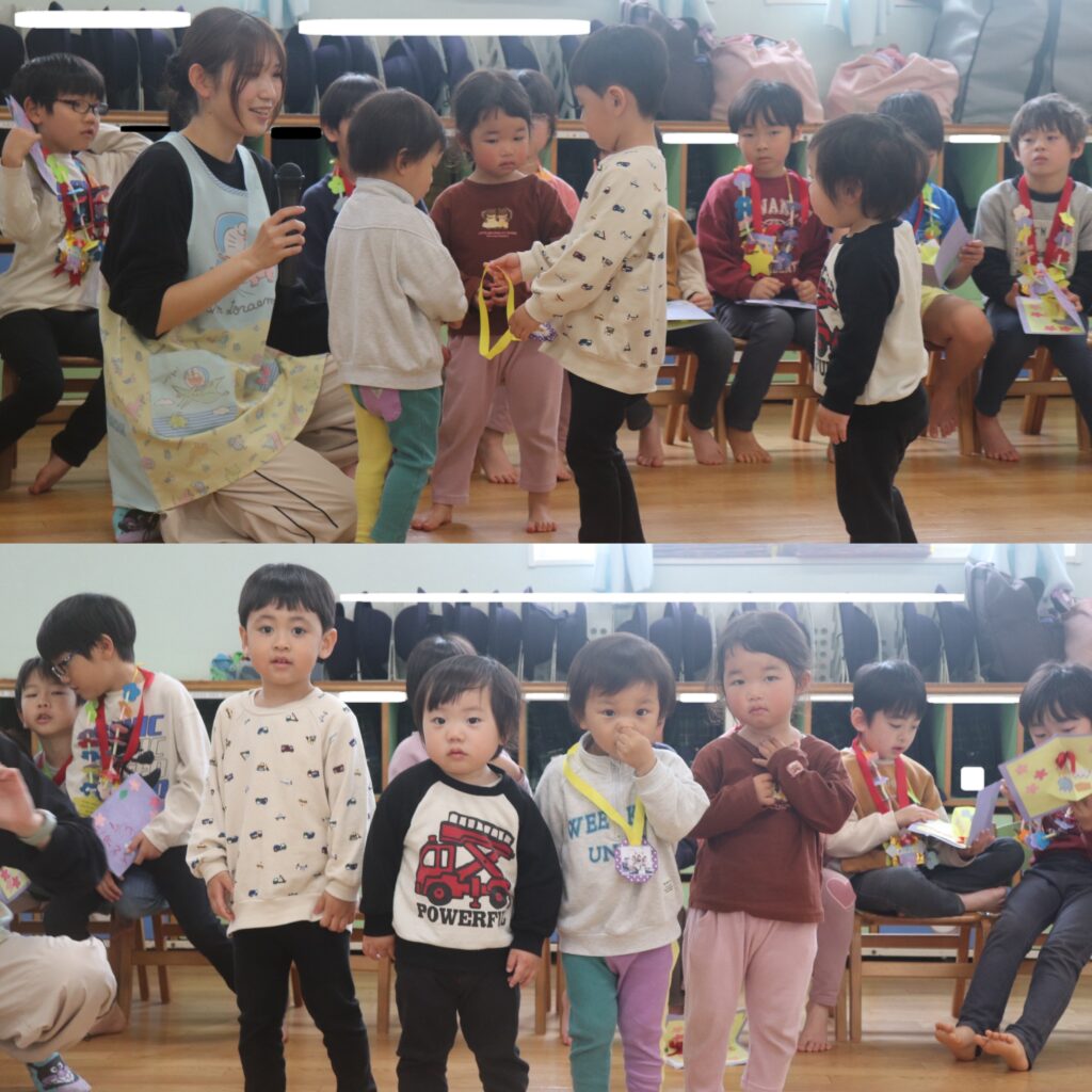 今日で転園してしまうりす組のお友達に、先生たちからのプレゼントのメダルをひよこ組から一緒だったお友だちが渡しました。