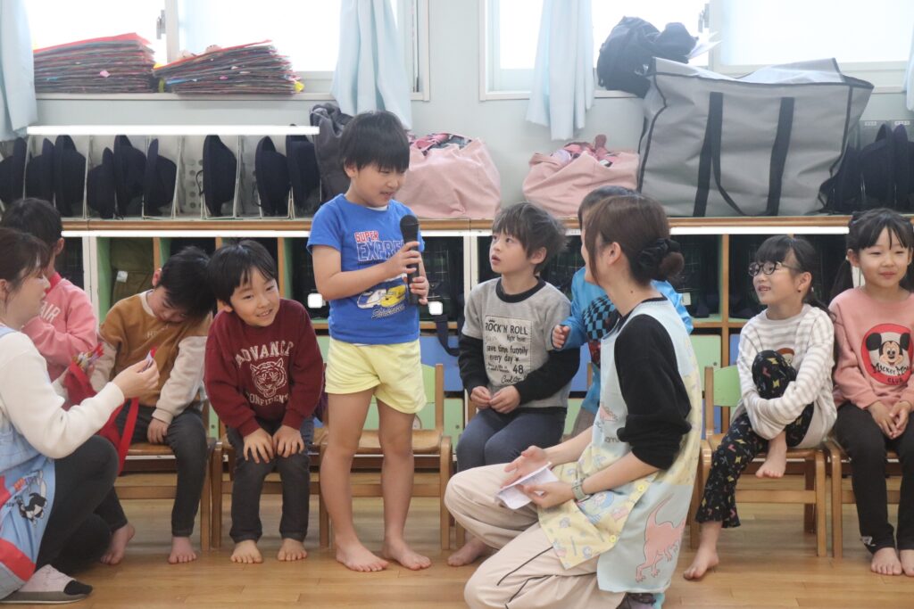 まずは一人づつ「保育園で楽しかったこと」のインタビューを受けました。