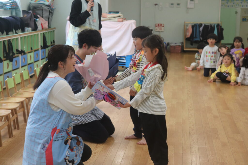 今日で転園してしまうりす組のお友達に、先生たちからのプレゼントのメダルをひよこ組から一緒だったお友だちが渡しました。