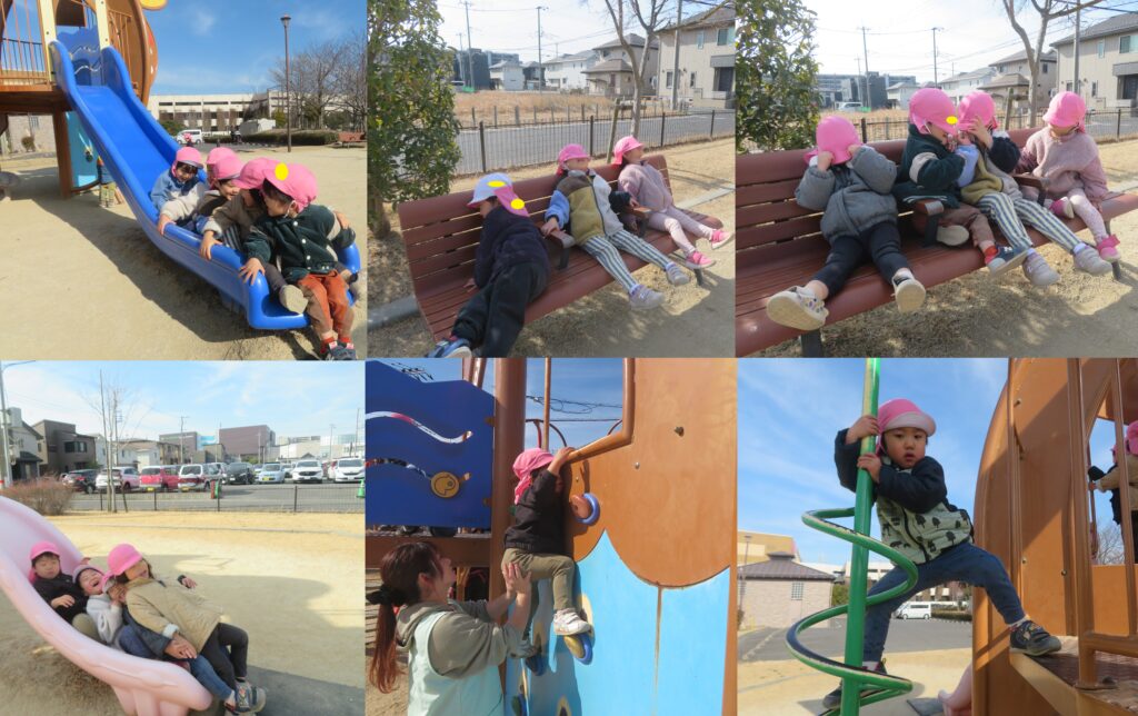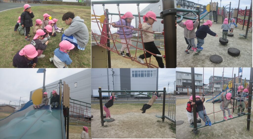 うさぎ組の様子 2026-03-23 うさぎ組で過ごすのも残りわずかとなってきました。身の回りの事も、「やってー」とお手伝いを求めることも減り、何でも自分でやろうと頑張っています。手先も器用になり、色んなことが上手に出来るようになってきました。様々な遊びの中でお友だちとの関わりを楽しんで遊べるようにもなってきました。 お外に行く準備も早くなり、色んな公園で遊んだね! たくさん思い出が出来ました!