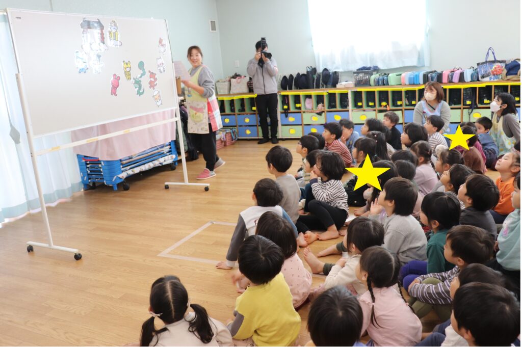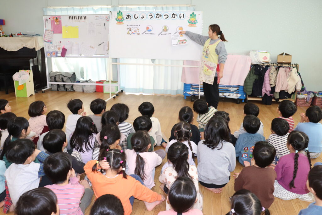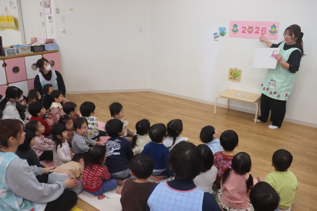 幼児組さんは、干支について話しを聞いたりお正月のクイズをして楽しみました。聞く時は静かに聞き、クイズでは元気に答えて楽しんでいました。