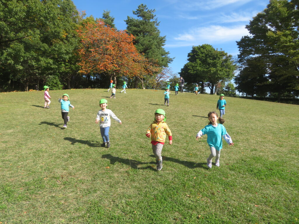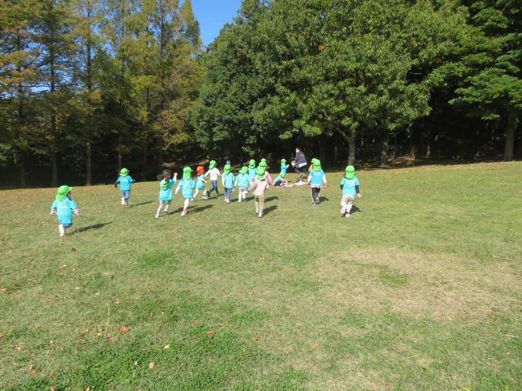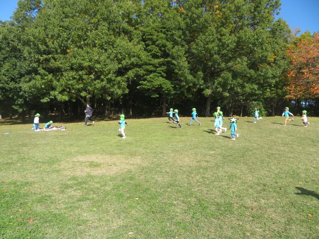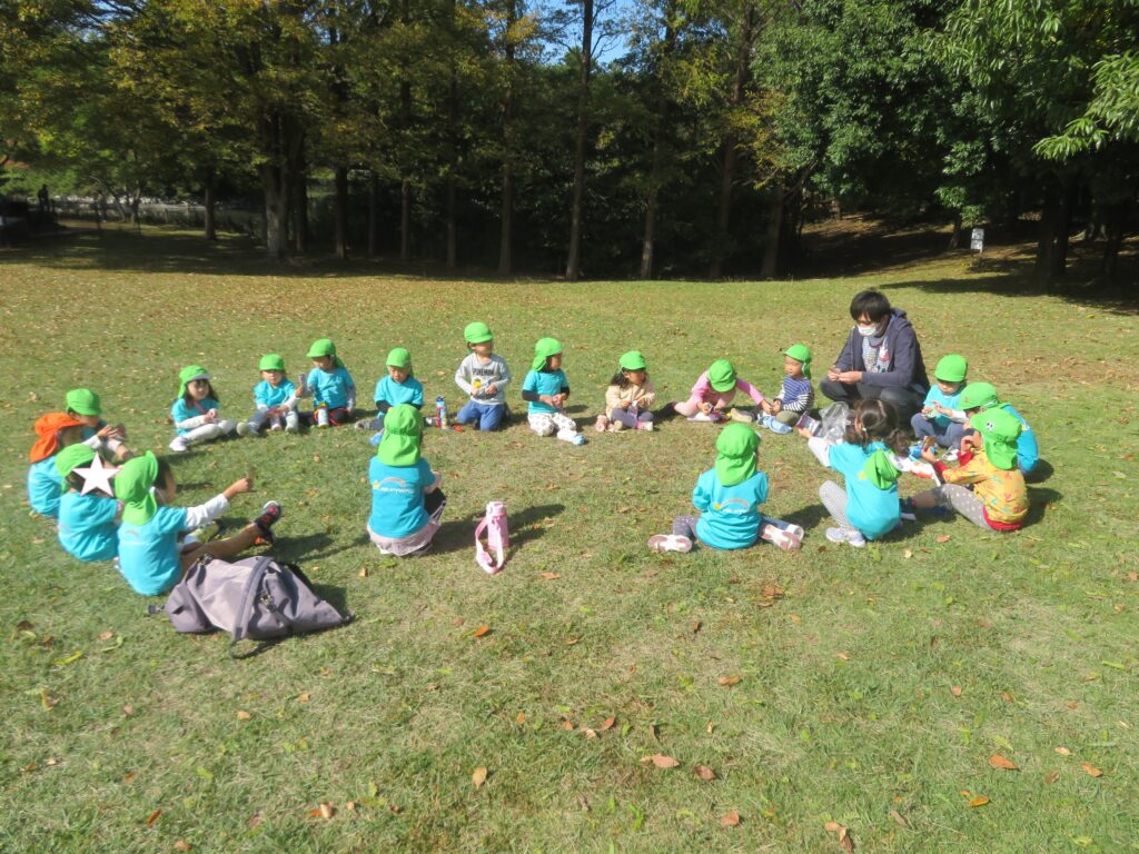 広場まで移動し、みんなで丸くなり待ちに待ったおやつタイムの時間でしたが、思ったよりサクッと食べ終え、また広場で走り始めた子ども達。