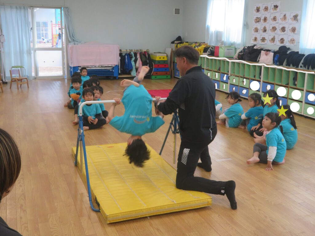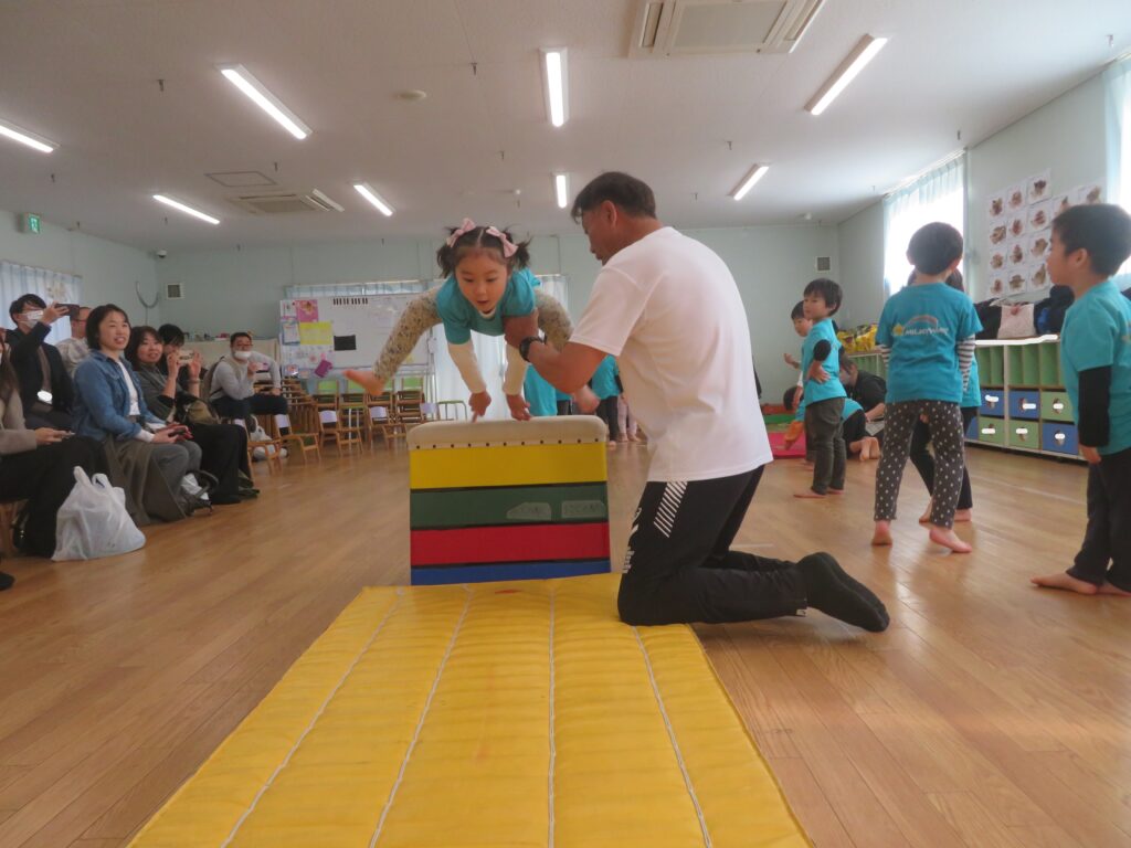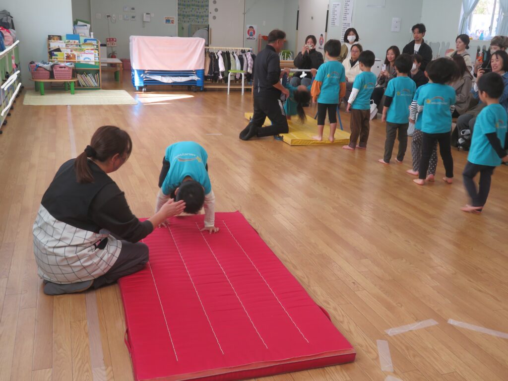 毎週水曜日に行っている体操教室。何事においても「自分の力でやってみよう」と思う心を育めるように練習を積み重ねています。年に1回の体操教室参観の様子です。
