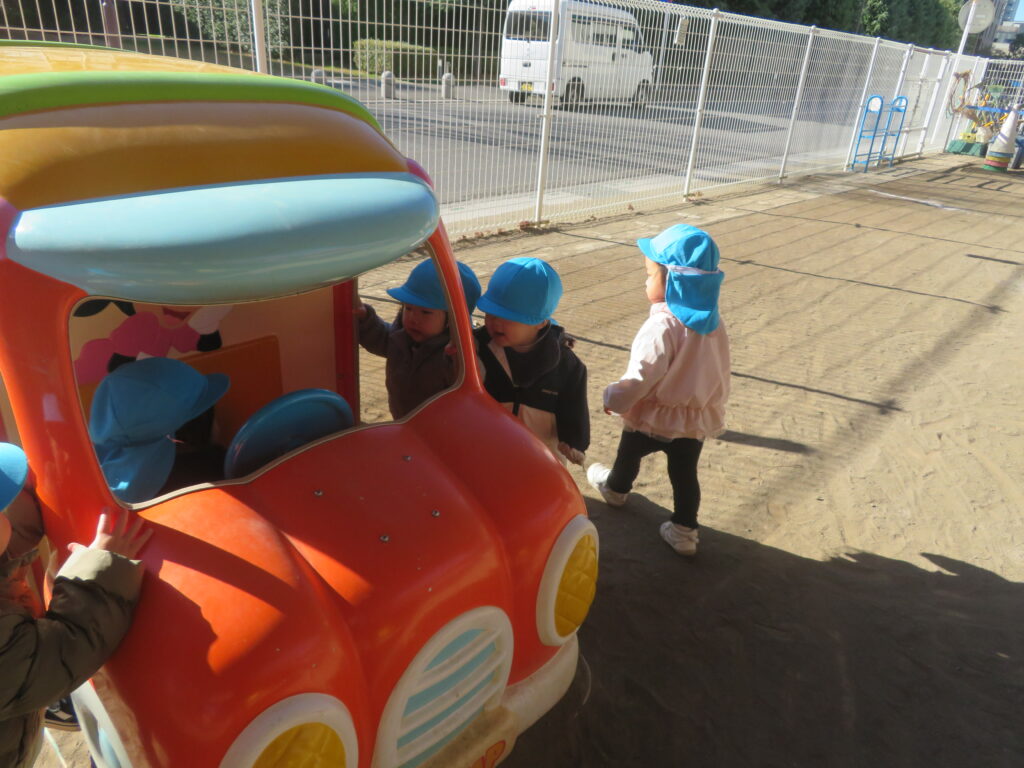 ひよこ組の1番人気?の車型遊具。子どもたちが集まり大にぎわい。