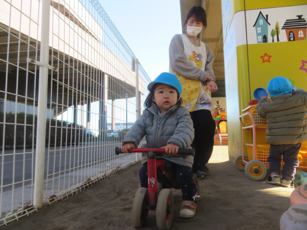 園庭では砂場遊びや足こぎ四輪車等、思い思いに好きな遊びを楽しんでいるひよこ組の子どもたち。