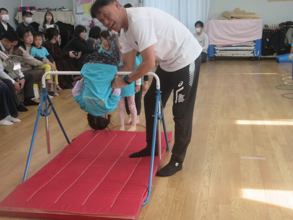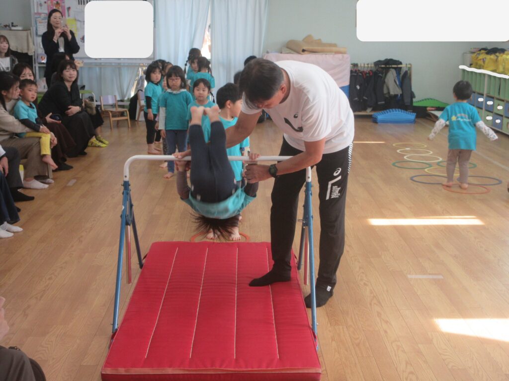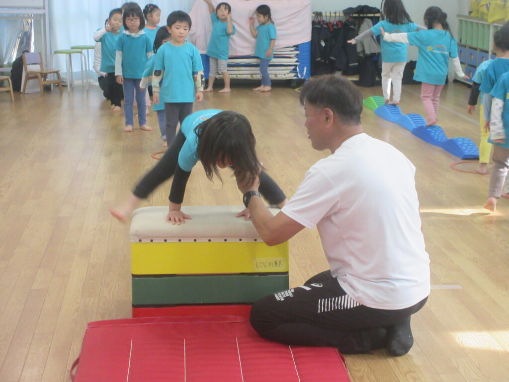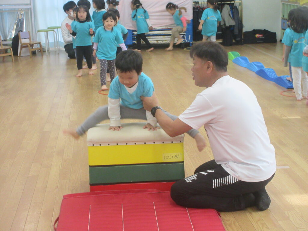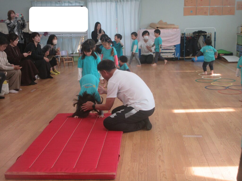 やってみようの心を育む ぺんぎん組編 2025-11-12 毎週水曜日に行っている体操教室。何事においても「自分の力でやってみよう」と思う心を育めるように練習を積み重ねています。今日は年に1回の体操教室参観がありました。 まずは準備体操と柔軟体操 マットは「前転」に挑戦 鉄棒は「前回り」 最後は跳び箱に挑戦しました。 体操教室参観でのお子様たちの嬉しそうな姿、恥ずかしそうにしている姿等、「お子様たちの今」を見ていただけたのではないかと思います。たくさんの保護者の皆様にご参加頂きありがとうございました。