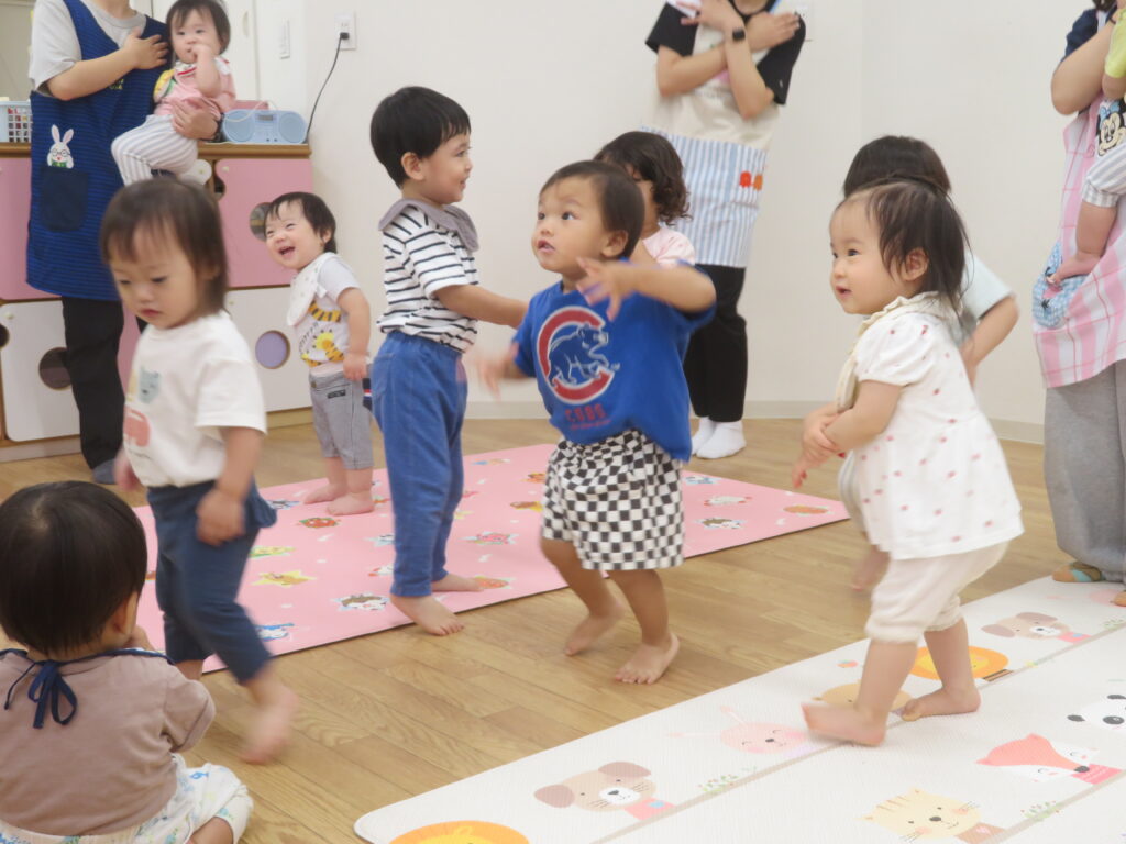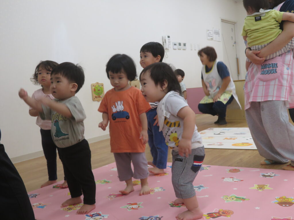 曲が始まると保育者の動きをしっかり見て、保育士の真似をしてやってみようとする子どもが増えていきます。