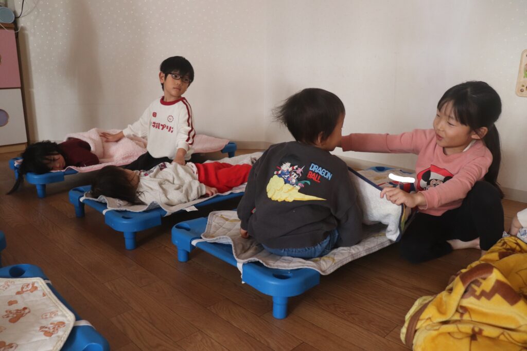 寝かしつけでは、そーっとお部屋に入っていき、コットの間に正座をして優しくトントンしてくれています。寝かしつけが終わり、お部屋に戻ってくると、「2人寝かせることができたよ!」となんだかとっても誇らしげです😊