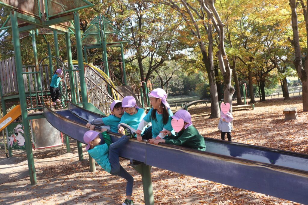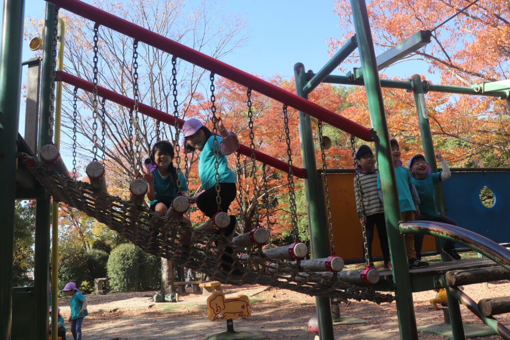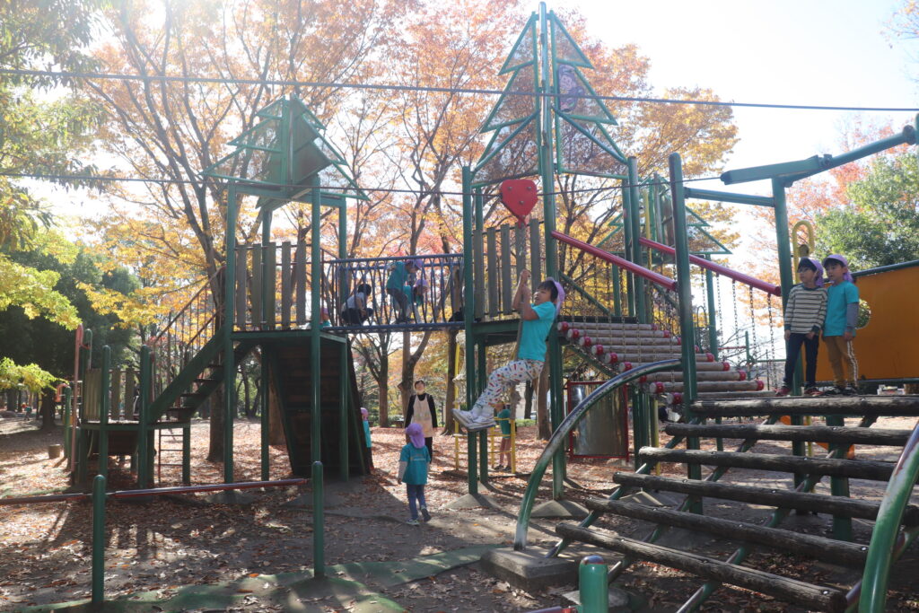 公園に着き、普段通らない道を通ってみるとお休みの日に遊びに行っている子が多く、公園内を教えてくれる頼もしい姿がありました。落ち葉を踏みしめながら歩いていくとお待ちかねのアスレチックが見えてきました。