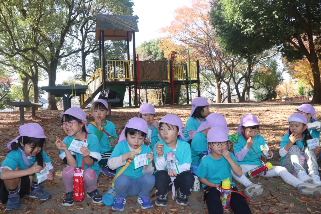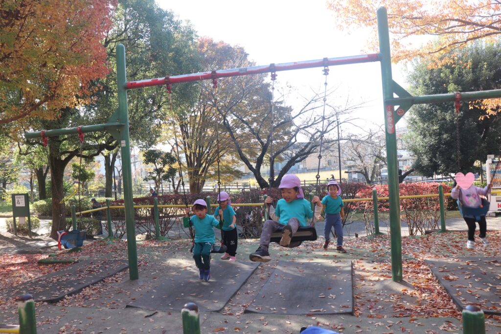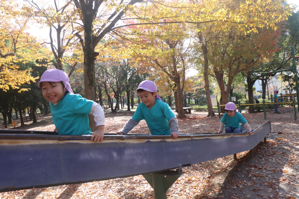 落ち葉がたくさんあり、葉っぱを集めて降らせたり、「まっかなあき」の歌詞に出てくる真っ赤なもみじの葉っぱを見つけたりと秋の自然も感じることが出来ました。