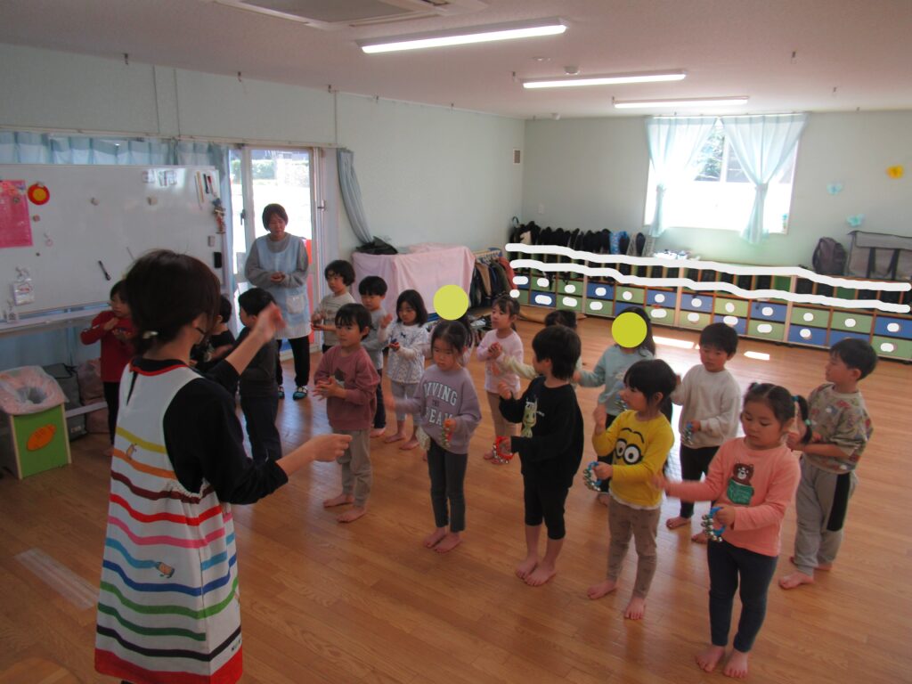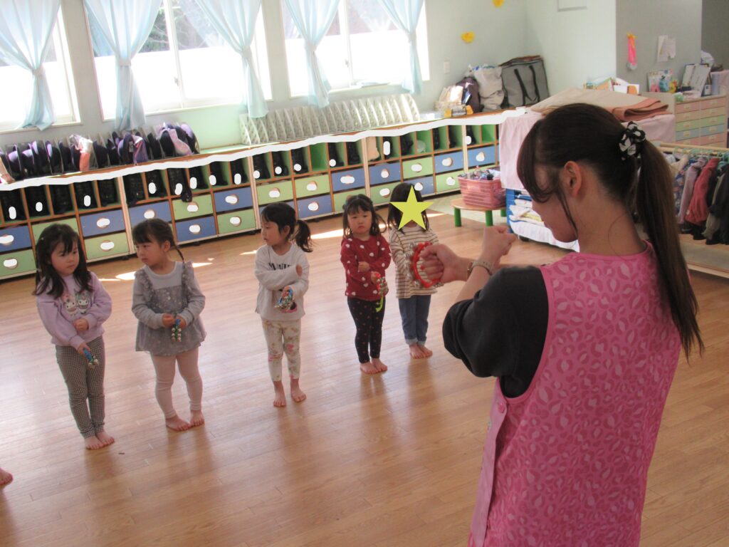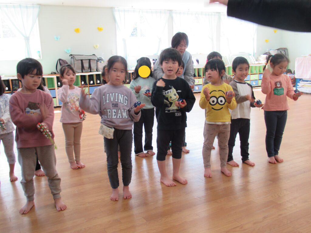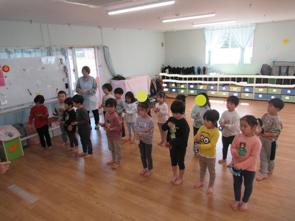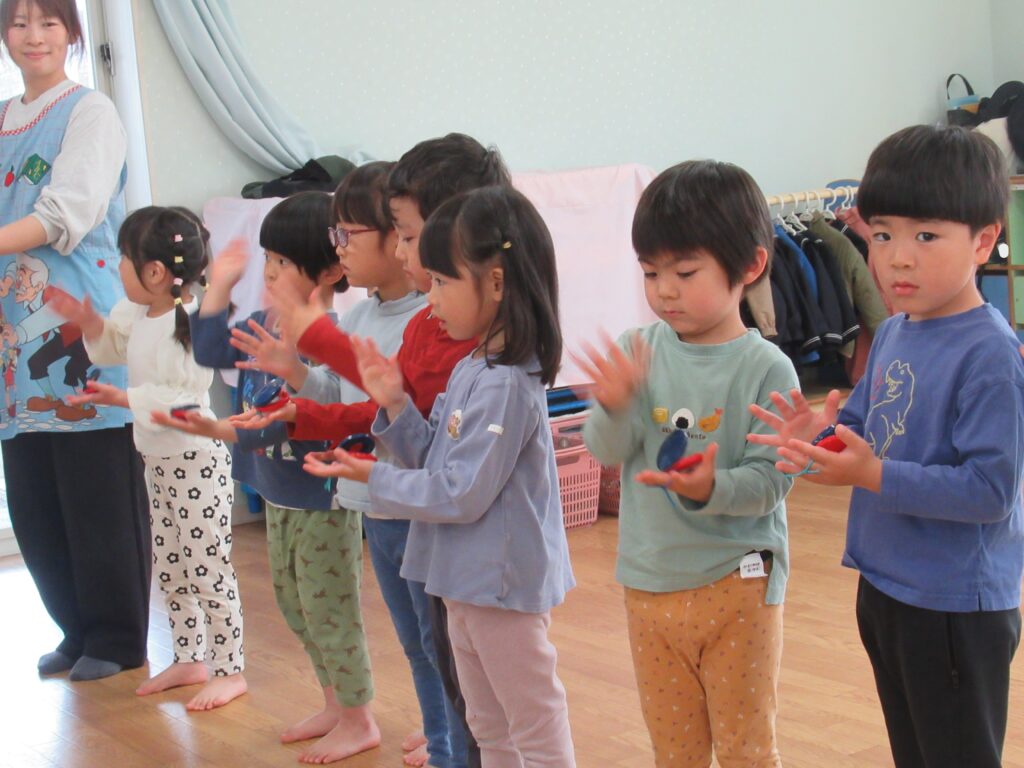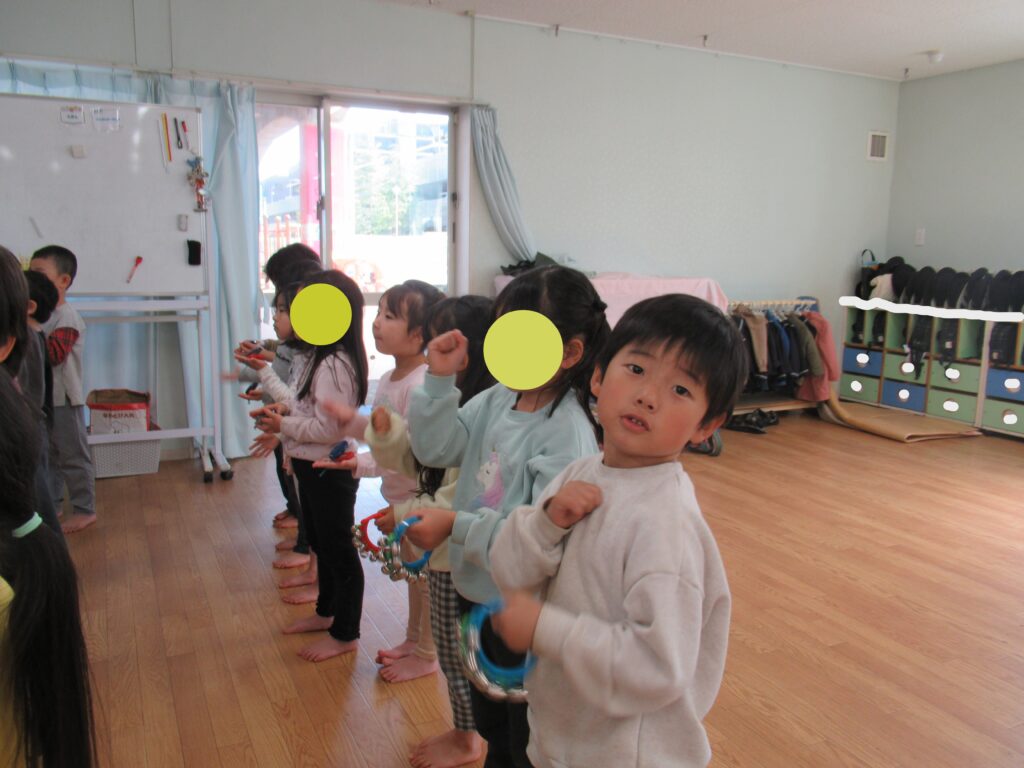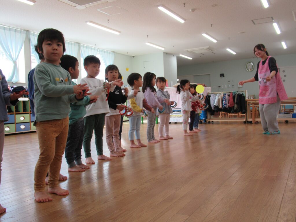 リトミック教室の様子 ぱんだ・らいおん組 2026-04-03 今日は今年度初めてのリトミック教室がありました。鈴とタンバリンを使って春の曲に合わせてリズム遊びを楽しみました。 ぱんだ組の様子 らいおん組の様子 今年度もたくさんの音に触れて楽しい時間を過ごしましょう。