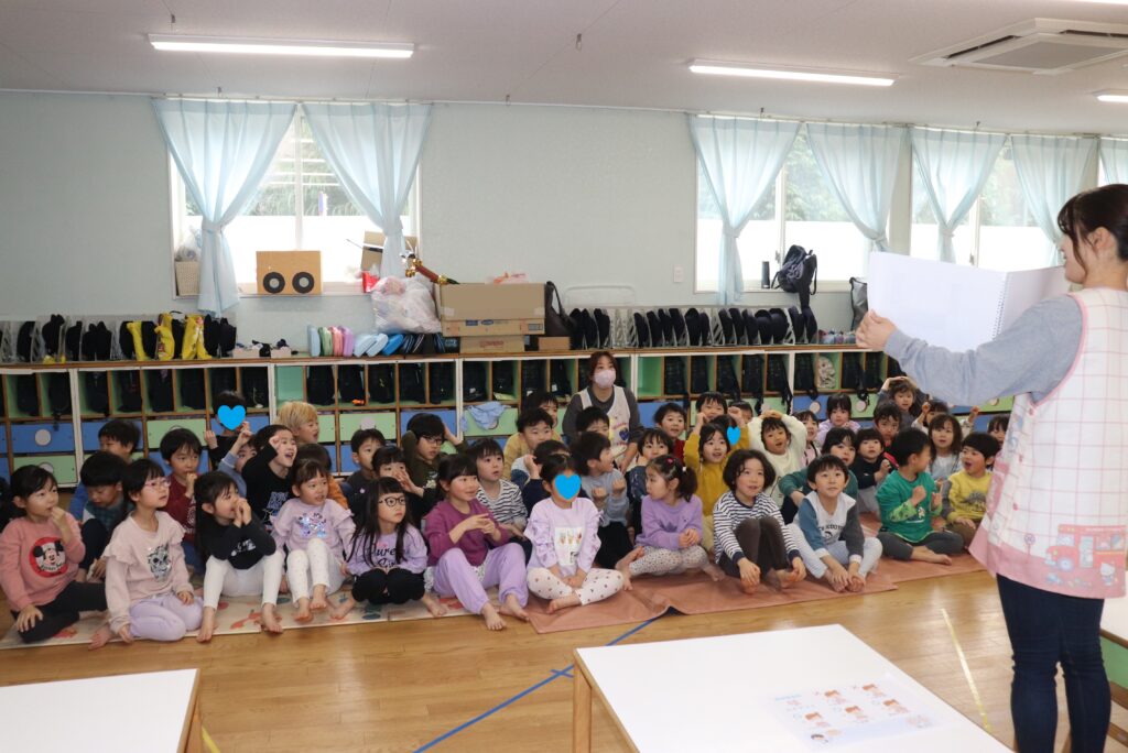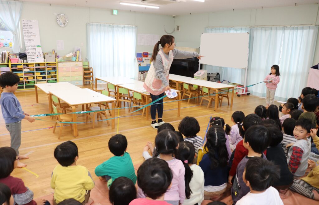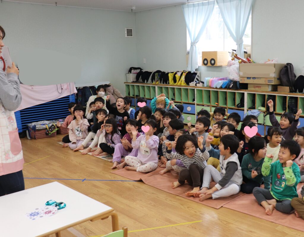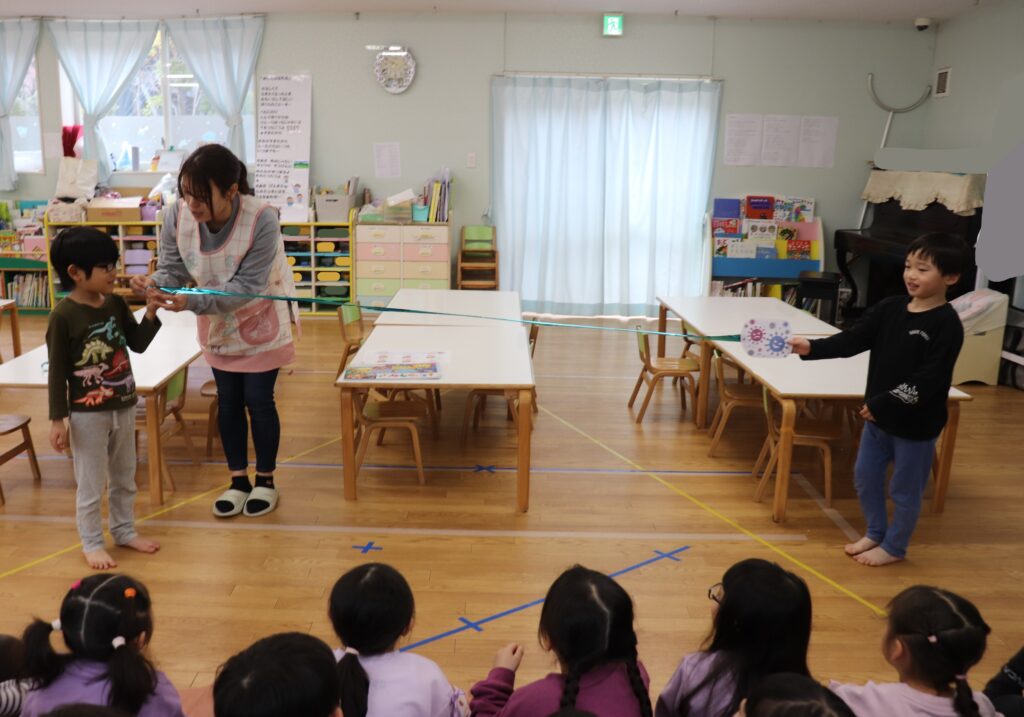 咳エチケットについて😷幼児組 2026-02-17 幼児組で咳エチケットについて保健指導をおこないました。 ○×クイズを楽しみながら、咳をする時の方法を知りました。 Q.鼻、口を手で覆う の答えが×で「えー!!」と驚いていましたが 「手は他のところを触るから!」と、 ×の理由をぱんだ組の友達が教えてくれました! 咳エチケットを守らずに咳をすると、どのくらいバイ菌が飛ぶのかを見てみました🔍 くしゃみの飛沫距離は更に長く、「長すぎー!!」と驚いていました😲 咳エチケットを意識し、元気いっぱい過ごせるといいですね✨