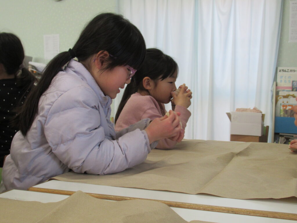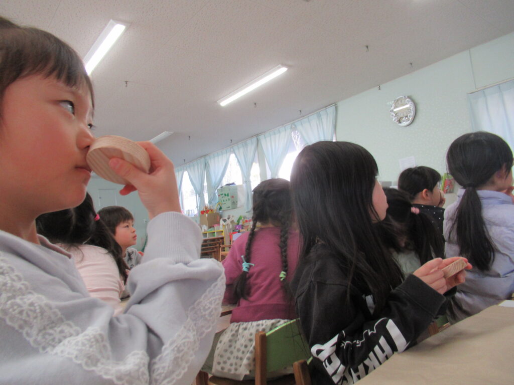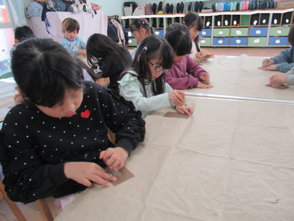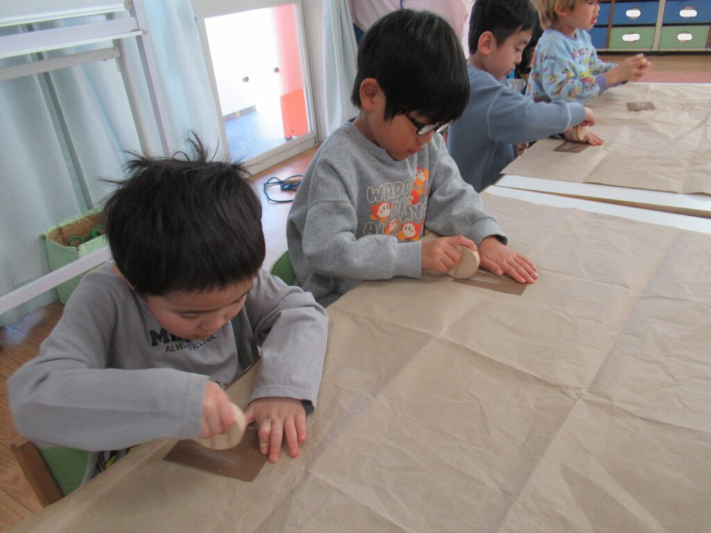 木育活動 2026-02-02 にじの駅保育園では木と触れ合うことにより五感を刺激し感性を高め、考える、作る、使う経験を通し、人や自然に対するやさしや思いやりを育めるように木育活動を行っています。 まずは木の香りをかいでみたり、木片の切り口を触ってみました。つるつるしてる、ざらざらしてる等、楽しそうに友達と話しをしていました。 次はざらざらしたところに紙やすりをかけました。 紙やすりでこすると、もっと木のにおいがすると木のにおいがつよくなったことに気がついた子もいました。