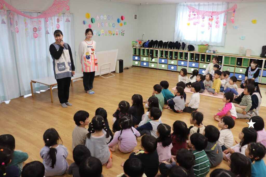 園長先生や新しい先生のお話を聞いたり、パネルシアターにも楽しんで参加していました。