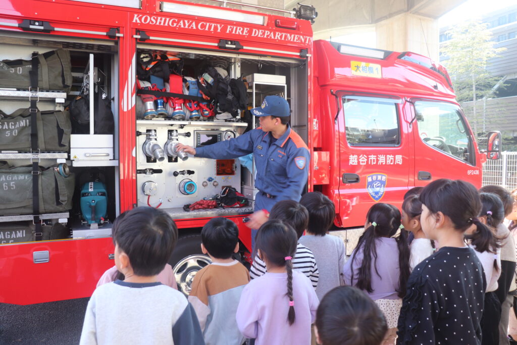 消防車に積んでいる機材を間近で見て何に使うのかを説明してもらいました。子どもたちは興味津々で見たり聞いたりしていました。