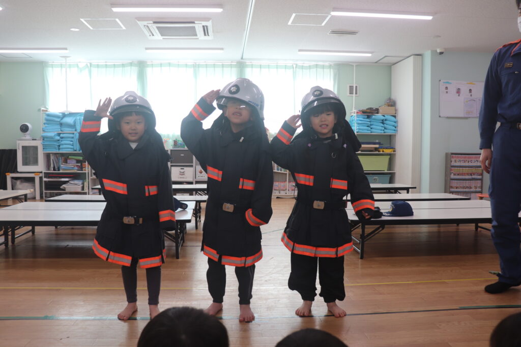 今回は、消防署の方が立ち合い訓練をしてくださり、子どもたちの避難する様子をみてお話ししてくださいました。