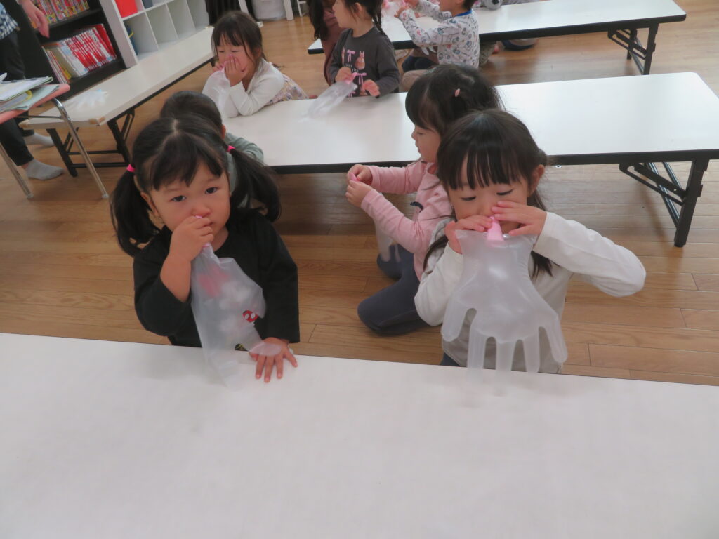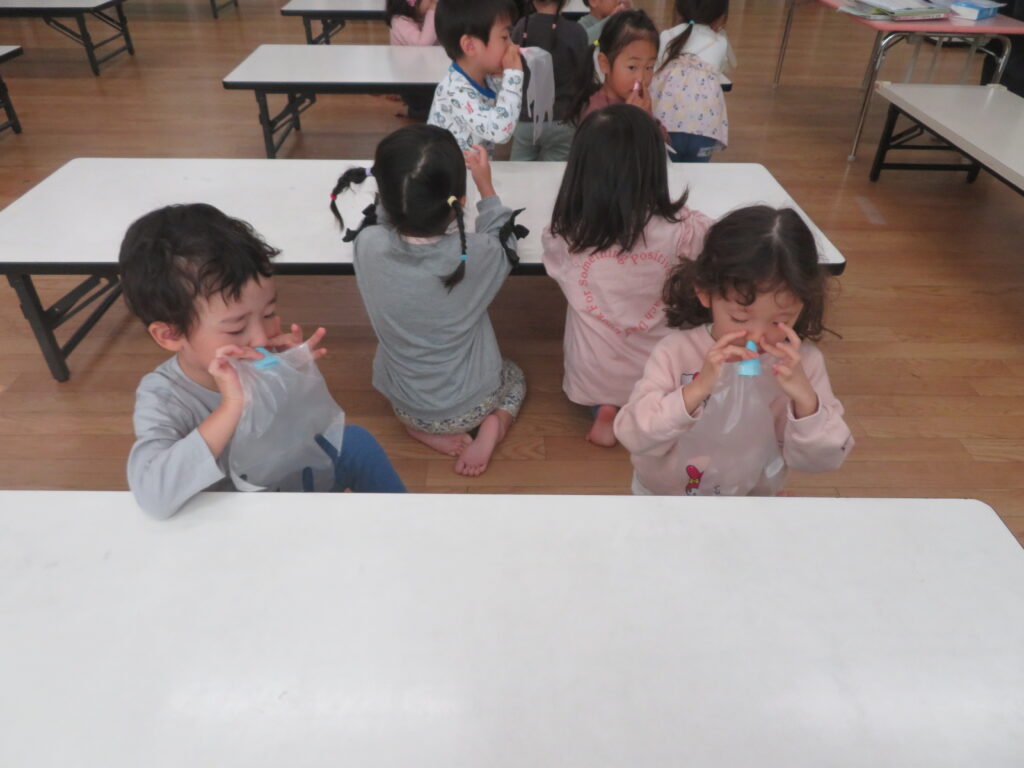 鼻のかみかた ぺんぎん組 2025-10-31 今日はぺんぎん組さんで「鼻のかみかた」の保健指導をしました。 何で鼻をかむのか。 鼻のかみかたは合ってるのかなー? ということを話した後、 ・両方の鼻でかむのではなく片方の鼻を抑えてかむ ・力強くかまない ・ゆっくり、何度かに分けてかむ という正しい鼻のかみかたについて学びました。 その後は、「鼻かみゾウさん」を使用して、鼻のかみかたの練習をしました。