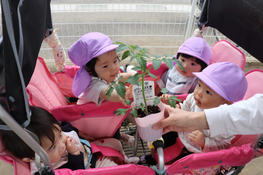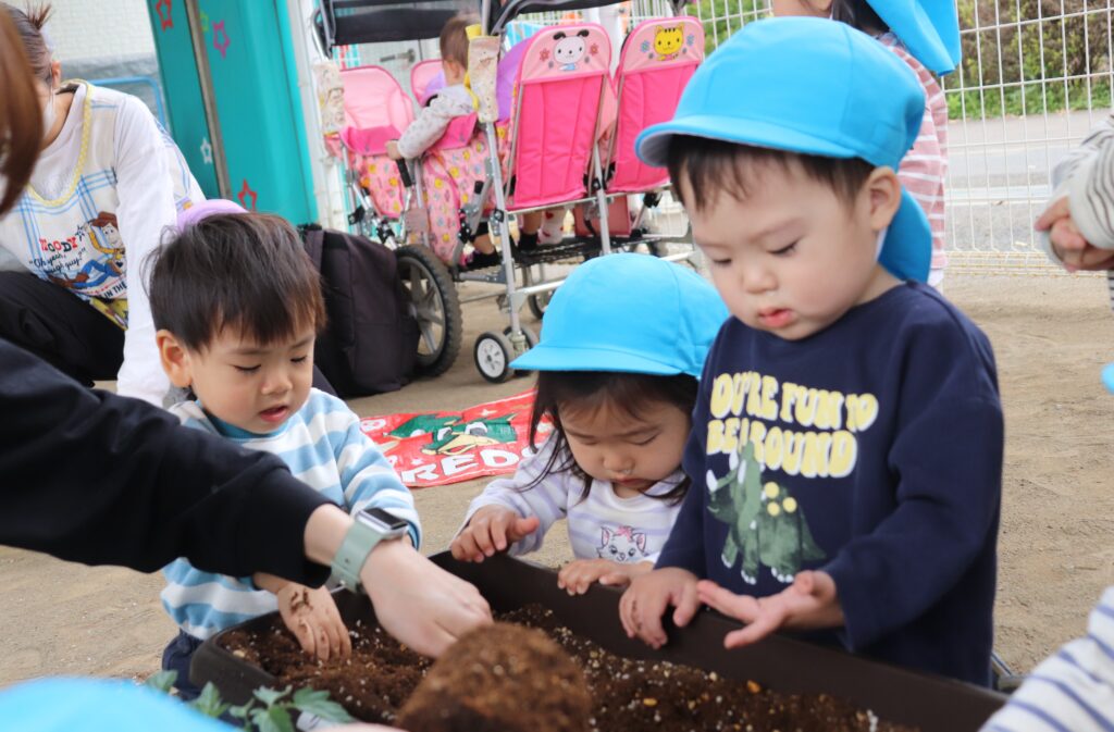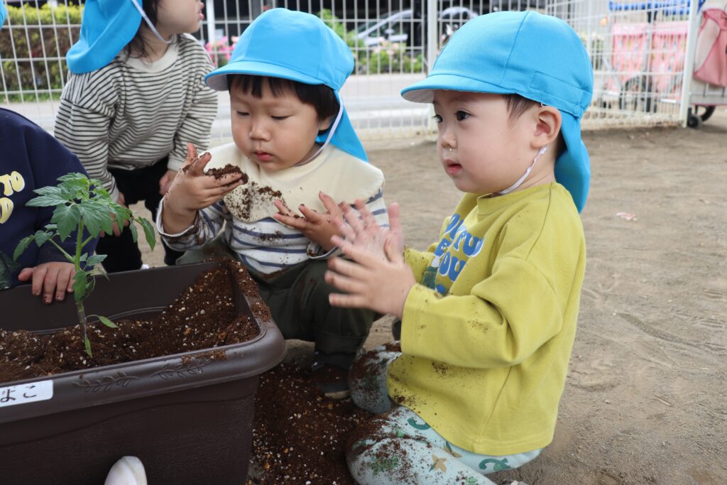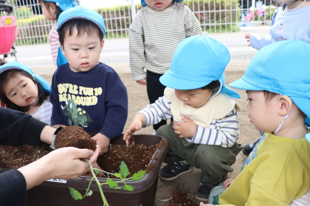 🐥ひよこ・りす組 苗植え🐿️ 2026-04-28 ひよこ・りす組で、ミニトマトの苗植えをしました🍅 苗に興味津々な様子でした! みんなで順番に土を掘り プランターから土があふれるほど、一生懸命掘っていました😂 土を均して、水やりをしました🪴 収穫が楽しみですね✨