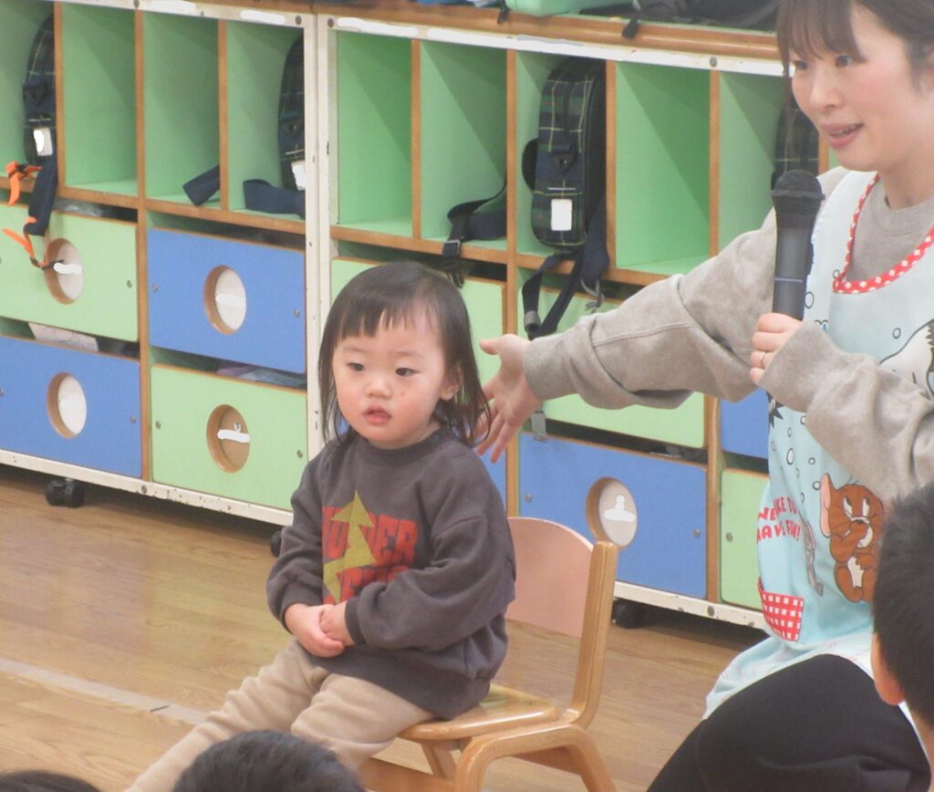 1月 お誕生会 2026-01-20 今日は、1月のお誕生日会がありました。 1月生まれのお友だちは、1人でした。 インタビューでは、たくさんのお友だちを目の前にして、少しドキドキしている様子でしたが、マイクにお口を近づけてお話しようとしてくれました! 最後に、ハッピーバースデーのお歌と、幼児組のクラスのお友だちからのカレンダーマーチのお歌のプレゼントがありましたよ。 とっても素敵なお歌のプレゼントでした! りす組の担任の先生と一緒にハイポーズ! お誕生日おめでとう。これからも元気いっぱい大きくなってね!