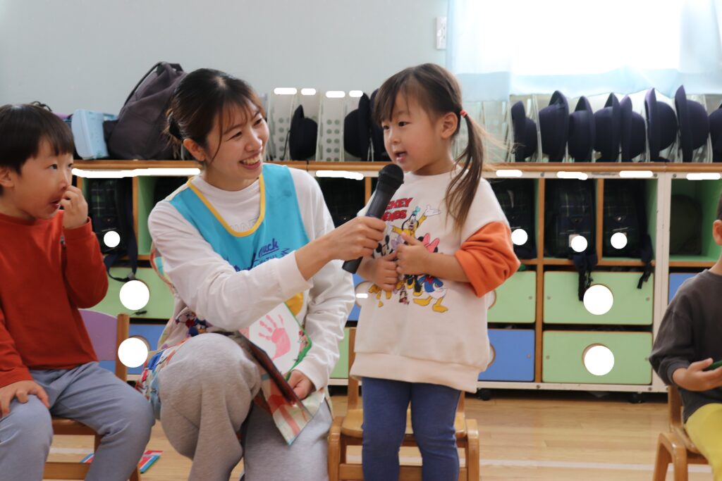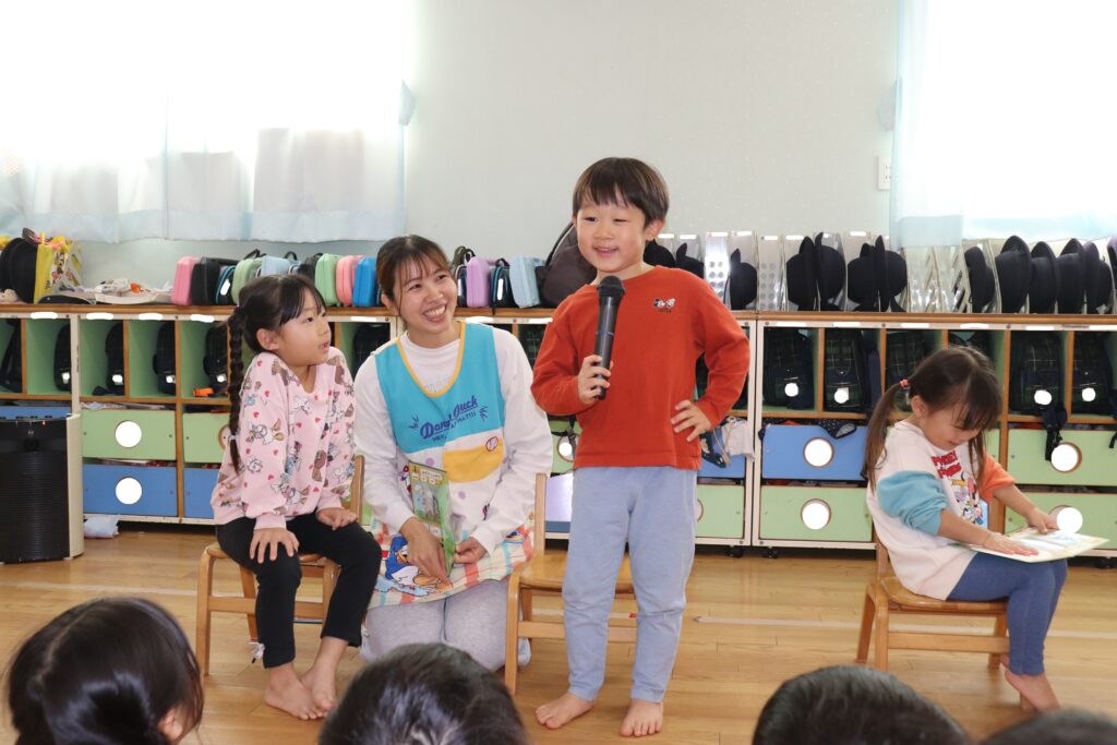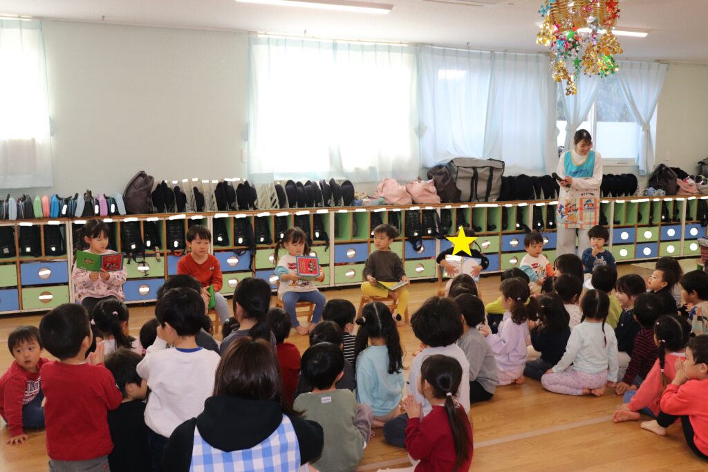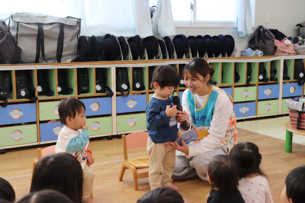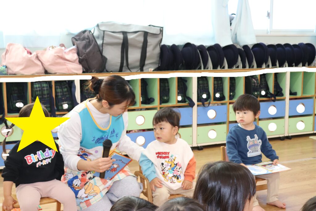 12月誕生日会 2025-12-23 今日は12月のお誕生日会がありました。 12月生まれは7名のお友だちがいました。 乳児組のお友だちは上手にお返事出来たり、自分の名前や好きな食べ物を答えることができました!幼児組さんもお名前や何歳になったか、好きな食べの物や大きくなったら何になりたいかを悩みながらもしっかりと答えてくれました! みんなで歌や「お誕生日おめでとう!」のプレゼントでお祝いしました! お誕生日おめでとうございます!!