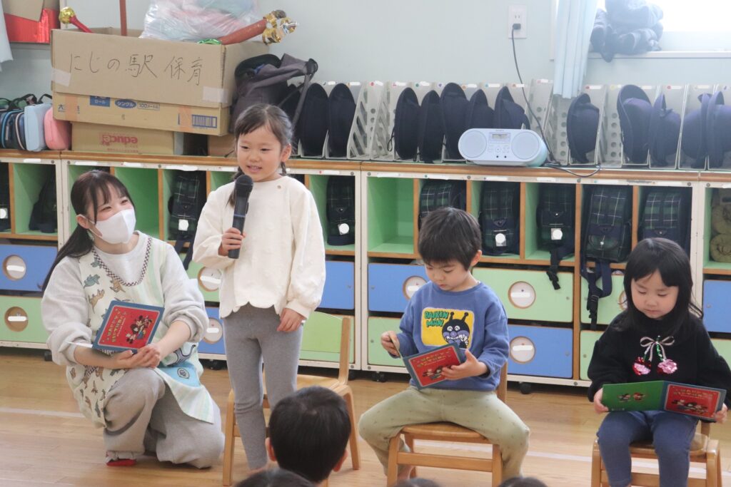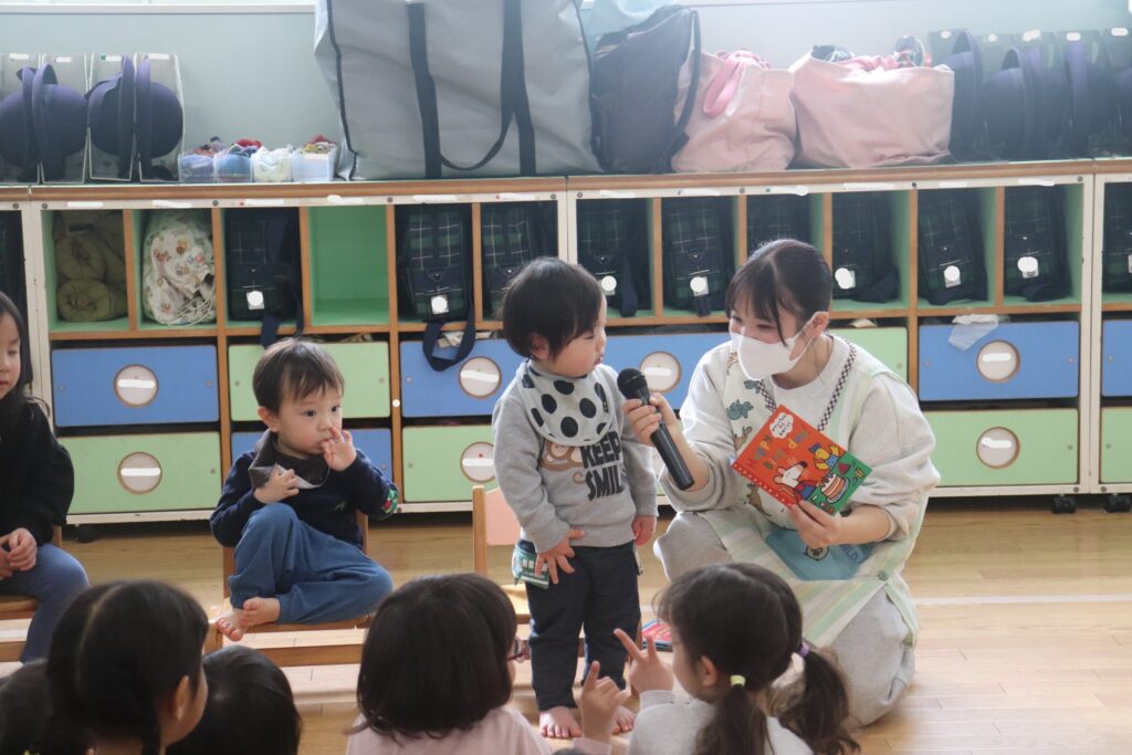 乳児組のお友だちは、みんなの前に立つことが恥ずかしく緊張している様子が見られました。誕生日カードをもらうと嬉しそうにしていました😊