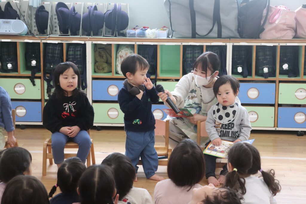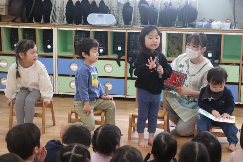 幼児組のお友だちは、少し緊張しながらも自分でマイクを持ち、お名前を言い、好きな食べ物や、将来の夢をお話してくれました。かっこいいお兄さんの姿、可愛いお姉さんの姿が見られました!