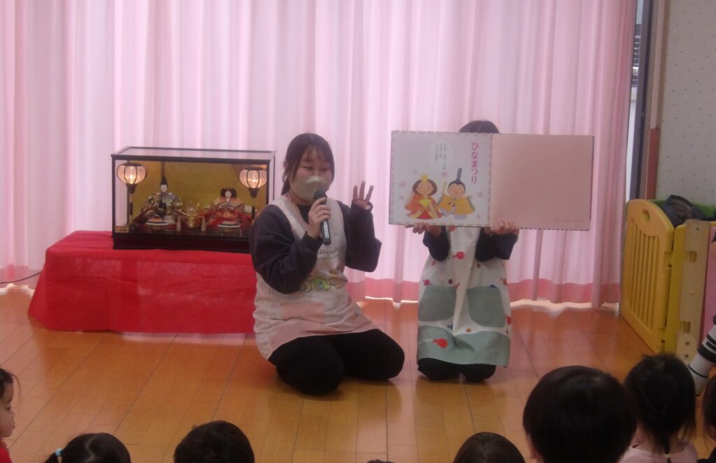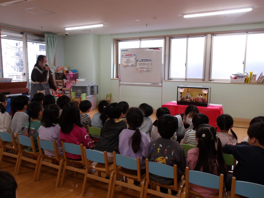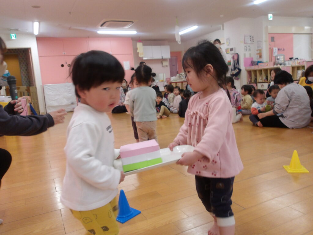 3月3日(火)にひな祭り集会がありました🌸 ひな祭りの由来に関するお話を聞いた後、乳児組はみんなで製作発表と菱餅運びゲームを楽しみました!